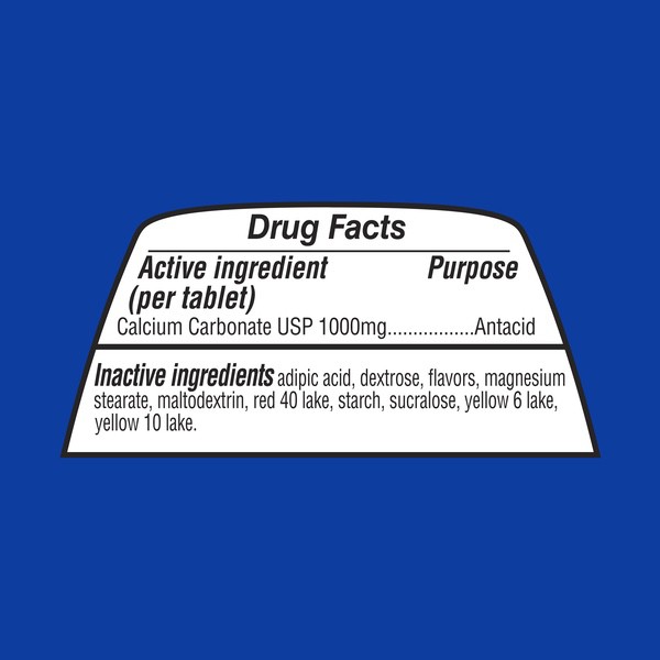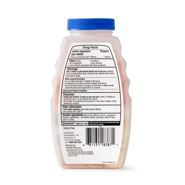 About This Item We aim to show you accurate product information. Manufacturers, suppliers and others provide what you see here, and we have not verified it. See our disclaimer Get fast-acting heartburn relief with Equate Ultra Strength Calcium Carbonate Antacid Chewable Tablets. Whether you've recently had a large meal or are simply sensitive to certain foods or beverages, these ultra-strength, tropical fruit-flavored antacid chewable tablets work to soothe your symptoms in seconds. A fruity taste helps each tablet go down smoothly and easily. The unique formula uses calcium carbonate to neutralize excess acid in the stomach, so you can get back to your day. The active ingredients in these antacid chewable tablets are comparable to those found in Tums Ultra Strength. Don't let painful heartburn hold back your day. Get the relief you need, right when you need it, with Equate Ultra Strength Antacid Chewable Tablets. The bottle features a contoured design for a firm grip while dispensing the amount you need. Making the right health decisions can be challenging. With a complete range of products and simple solutions, Equate allows you to take care of your family with confidence. Equate Ultra-Strength Antacid Tropical Fruit Chewable Tablets, 1000 mg, 160-Count: Relieves acid indigestion, heartburn and a sour stomach Fast-acting heartburn relief Tropical fruit flavors Long-lasting antacid barrier Antacid chewable tablets are easy to take Active ingredient (in each tablet): calcium carbonate USP 1000 mg Compare to Tums Ultra Strength active ingredients Curved and contoured bottle for an easy grip Suitable for adults and children ages 12 years and up