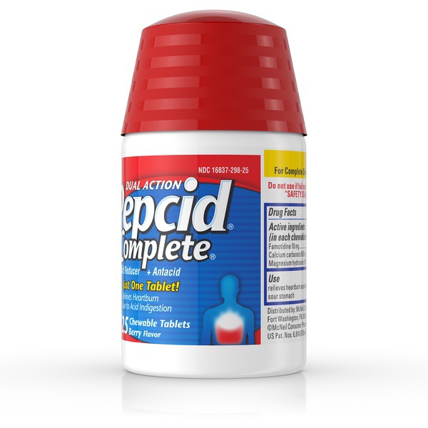 About This Item We aim to show you accurate product information. Manufacturers, suppliers and others provide what you see here, and we have not verified it. See our disclaimer Quickly relieve heartburn associated with acid indigestion and sour stomach with Pepcid Complete Acid Reducer + Antacid Chewable Tablets. These berry- flavored chewable tablets combine a fast-working antacid and long-lasting acid reducer to help control acid all day and night.* Formulated with calcium carbonate, famotidine, and magnesium hydroxide, this heartburn reliever helps to neutralize and control acid. The dual-action formula starts working in seconds and lasts longer than Tums.** Whether at brunch or a new food spot, use Pepcid Complete for fast-acting relief so you don't have to worry about hurting now or hurting later. * Based on 9-hour acid control studies during the day and 12-hour acid control studies during the night. Acid control does not imply symptom relief.** Tums is a registered trademark of GlaxoSmithKline. 25-ct. bottle of Pepcid Complete Acid Reducer + Antacid Chewable Tablets in Berry flavor Acid controller helps relieve heartburn due to acid indigestion and sour stomach 1 tablet controls acid all day & night based on results of 9-hr daytime & 12-hr nighttime studies Contains 10 milligrams of famotidine, a known ingredient that acts as an acid reducer Also contains 400mg calcium carbonate and 165mg magnesium hydroxide, both antacids Dual-action formula starts relieving indigestion in seconds for heartburn relief that lasts These chewable berry-flavored tablets help neutralize and control acid for fast relief Keep a bottle of the antacids at home and in the office to relieve heartburn whenever it strikes