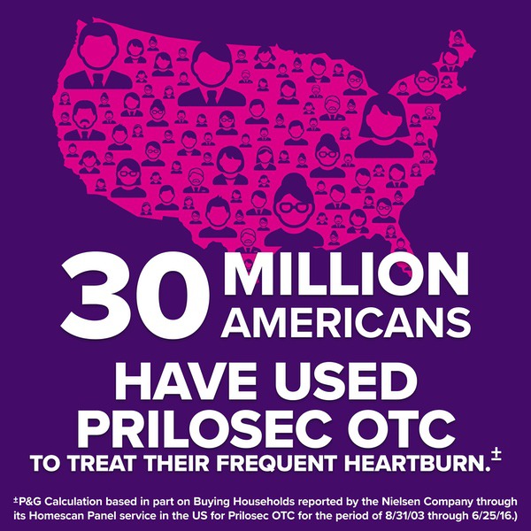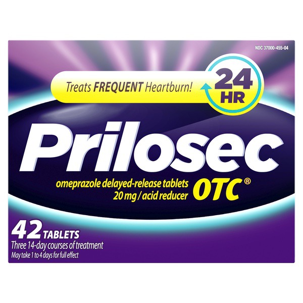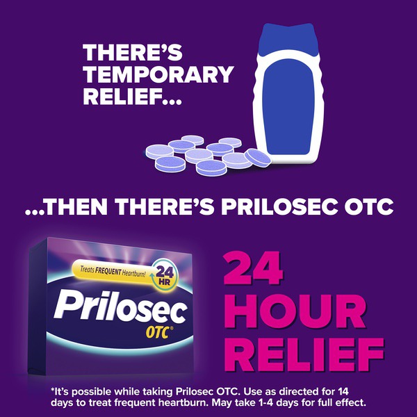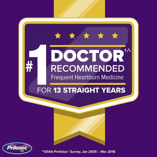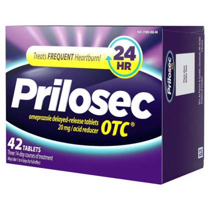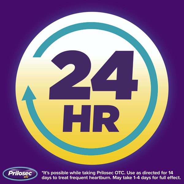 About This Item We aim to show you accurate product information. Manufacturers, suppliers and others provide what you see here, and we have not verified it. See our disclaimer With Prilosec OTC, you can take control of heartburn. If you suffer from frequent heartburn, there’s no need to stash antacids everywhere for whenever heartburn might strike. With Prilosec OTC, you can take 1 PILL A DAY for 24 HOURS of ZERO HEARTBURN.* Prilosec OTC is the first and original over-the-counter frequent heartburn (defined as occurring 2 or more times per week) medicine. The active ingredient in Prilosec OTC is omeprazole magnesium delayed-release tablet 20mg (equivalent to 20.6mg omeprazole), which is part of a class of medications called proton pump inhibitors, or PPIs. PPIs reduce stomach acid production by shutting down many of the pumps in the stomach that produce acid. In other words, Prilosec OTC blocks acid production at its source, so you don’t get heartburn in the first place.* Take Prilosec OTC once a day and use as directed for 14 days to treat frequent heartburn. Prilosec OTC may take 1-4 days for full effect. Prilosec OTC is the #1 Doctor†, Gastroenterologist^ and Pharmacist^^ recommended OTC frequent heartburn medicine. *It’s possible while taking Prilosec OTC. Use as directed for 14 days to treat frequent heartburn. May take 1-4 days for full effect. ±P&G Calculation based in part on Buying Households reported by the Nielsen Company through its Homescan Panel service in the US for Prilosec OTC for the period of 8/31/03 through 6/25/16. †^IQVIA ProVoice™ Survey, Jan 2005 – Mar 2018 ^^Pharmacy Times Surveys, Acid Reducer/Heartburn Categories 2006-2018 Prilosec OTC Frequent Heartburn Relief Medicine and Acid Reducer, 42 Count – Omeprazole Delayed-Release Tablets 20mg - Proton Pump Inhibitor: ONE PILL A DAY. 24 HOURS. ZERO HEARTBURN.* With one pill a day, Prilosec OTC blocks acid production at the source so you don't get heartburn in the first place* THE FIRST AND ORIGINAL OVER-THE-COUNTER FREQUENT HEARTBURN MEDICINE. There's a reason 30 Million Americans± used Prilosec OTC to treat their frequent heartburn #1 DOCTOR†, GASTROENTEROLOGIST^, AND PHARMACIST^^ RECOMMENDED frequent heartburn treatment for 13 straight years TREATS FREQUENT HEARTBURN. There's no need to stash antacids everywhere for whenever heartburn might strike. With Prilosec OTC, you can take 1 pill a day for 24 hours of zero heartburn* BLOCKS ACID PRODUCTION AT ITS SOURCE. Proton pump inhibitors (PPIs) like Prilosec OTC reduce stomach acid production by shutting down many of the pumps in the stomach that produce acid