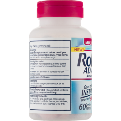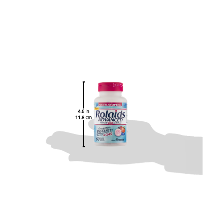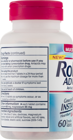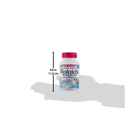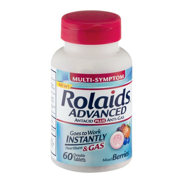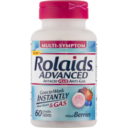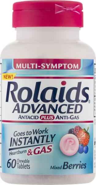 About This Item We aim to show you accurate product information. Manufacturers, suppliers and others provide what you see here, and we have not verified it. See our disclaimer Take relief to the next level. Rolaids Advanced tablets go to work to relieve the worst heartburn, bloating and gas. Rolaids Advanced tablets do more than just fight heartburn, sour stomach, and acid indigestion, they also help fight upset stomach associated with these symptoms, as well as pressure and bloating. Rolaids Advanced tablets have 2 heartburn fighting active ingredients - calcium carbonate and magnesium hydroxide, as well as an antigas ingredient - Simethicone. Rolaids Advanced tablets come in a mixed berry flavor. Rolaids is available in Regular Strength, Extra Strength, Ultra Strength and Advanced Strength tablets, as well as Ultra Strength Softchew forms. Rolaids Advanced Tablets, Mixed Berries 60ct Starts working as fast as now* Relieves heartburn, bloating and gas Contains both calcium carbonate, magnesium hydroxide and simethicone Mixed berries flavor * Refers to acid neutralization