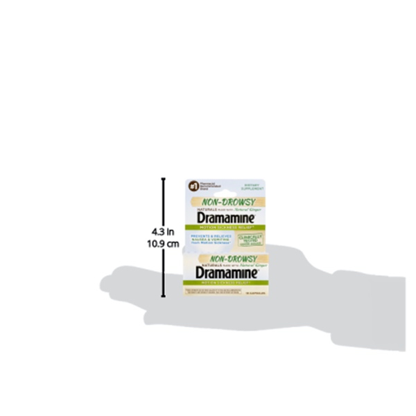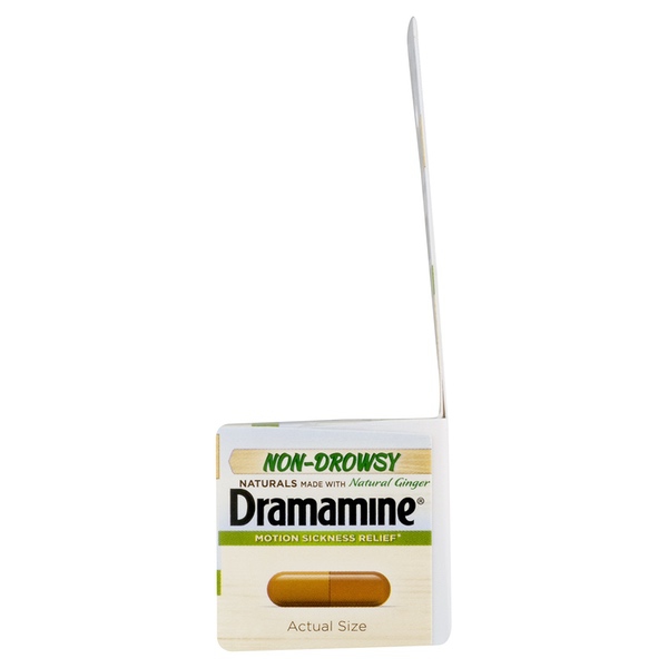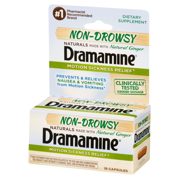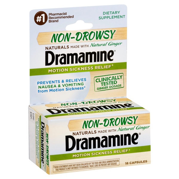 About This Item We aim to show you accurate product information. Manufacturers, suppliers and others provide what you see here, and we have not verified it. See our disclaimer - Dramamine’s first non-drowsy offering - Contains the clinically tested ginger dosage required for preventing and treating motion sickness - Prevents and treats the symptoms of motion sickness (nausea and vomiting) without drowsiness - Safe to use every day you travel since it’s made from natural ginger - 18 capsules Dramamine Non-Drowsy Naturals is the first non-drowsy solution for motion sickness from Dramamine. The product contains the clinically tested ginger dosage required for preventing and treating motion sickness. Other sources of ginger, including candies, gums, or ginger ale, may not contain a full clinical dose. It prevents and treats the symptoms of motion sickness (nausea and vomiting) without drowsiness. Dramamine Non-Drowsy Naturals is safe to use every day you travel, since it’s made from natural ginger, and it is safe for children ages 6 and up. Always bring Dramamine with you! You don't want to be caught in the air, on the water, or on the road without Dramamine. Depending on the cause, motion sickness is also referred to as airsickness, carsickness or seasickness. Here are some tips to help: 1. Whether on a cruise ship, a jetliner or a sailboat—the middle of the vessel tends to be the steadiest. Stay mid-boat at sea or reserve a seat over the wings when flying to avoid too many nauseating ups and downs. 2. If you know you are going on a rocky ocean-fishing adventure or helicopter tour that is likely to cause motion sickness, take Dramamine BEFORE boarding. Dramamine works best when taken as a precautionary measure. It also eases motion sickness after the fact, but why risk getting sick? 3. Take a turn at the wheel. Driving the car or small watercraft may distract you from feeling nauseous. Ask your friends if you can act as a captain. If you begin to feel motion sick and can’t drive, at least sit in the front seat. You’ll feel better if you can face the direction in which you’re headed and stare at a non-moving object. 4. Steer clear of fumes. Ferryboats, in particular, seem to chug out a lot of stinky exhaust that can make a seagoer go from slightly motion sick to all-out nauseated. 5. Toast your besties with a glass of bubbly ginger ale or stick to bottled water and focus on staying hydrated. Avoid alcohol, which can increase dehydration and nausea. Not only is Dramamine the most trusted over-the-counter treatment for motion sickness, it is the #1 Pharmacist Recommended brand to both prevent and treat the condition.