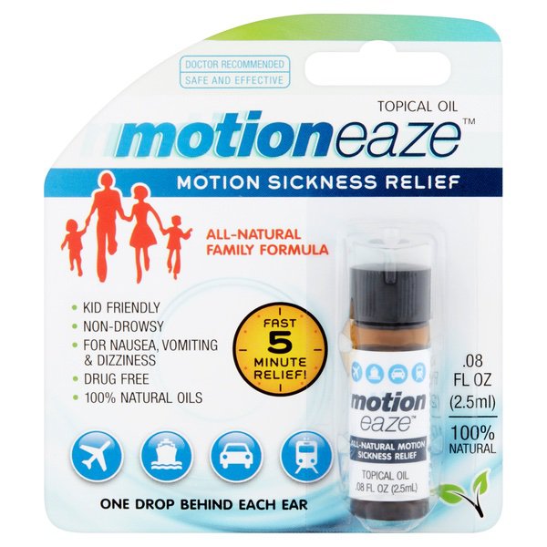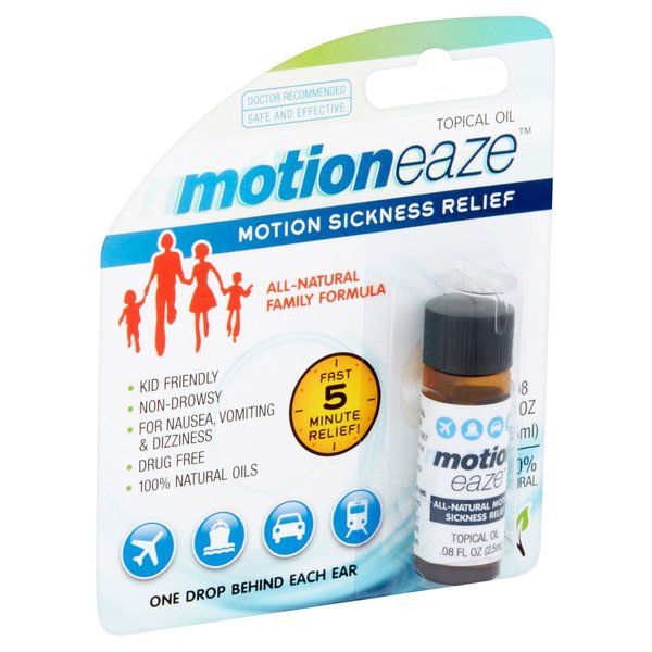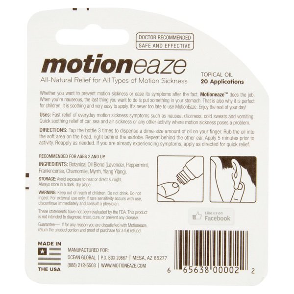 About This Item We aim to show you accurate product information. Manufacturers, suppliers and others provide what you see here, and we have not verified it. See our disclaimer This Motioneaze Motion Sickness Relief 20 Application Oil is designed to help you stay comfortable while you travel. It's suitable for both adults and children to use. This Motioneaze sickness relief oil is easy to apply Use it for fast relief of everyday motion sickness symptoms such as nausea, dizziness, cold sweats and vomiting. It's also ideal for quick soothing relief of car, sea and air sickness or any other activity where motion sickness poses a problem. This topical oil goes on your skin, there's no need to put medicine in your stomach when you're feeling queasy. It goes to work right away and takes full effect within five minutes. The natural formula is free of drugs for safety. It's recommended by doctors. The non-drowsy design means that it's suitable to use when you're driving. These statements have not been evaluated by the Food and Drug Administration. This product is not intended to diagnose, treat, cure or prevent any disease. Motioneaze Motion Sickness Relief Topical Oil, .08 fl oz, 20 Application: Doctor recommended Safe and effective All-natural family formula Motioneaze sickness relief oil is kid friendly Non-drowsy For nausea, vomiting and dizziness Drug free 100% natural oils Fast 5-minute relief 1 drop behind each ear 100% natural topical oil .08 fl oz per bottle 20 applications total per bottle Made with lavender oil, frankincense, peppermint, chamomile, myrrh and ylang ylang Recommended for ages 2 and up