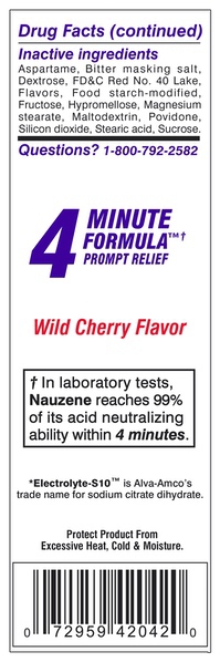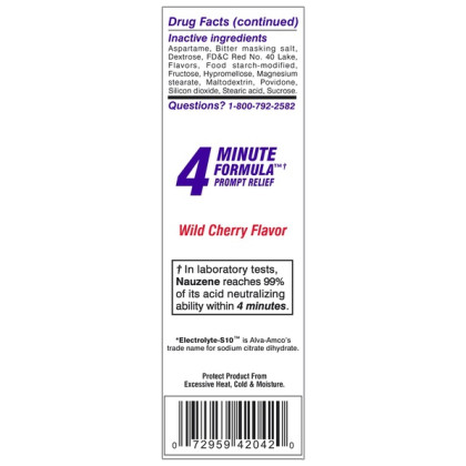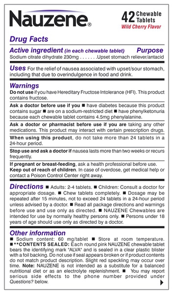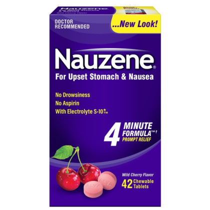 About This Item We aim to show you accurate product information. Manufacturers, suppliers and others provide what you see here, and we have not verified it. See our disclaimer >p> Doctor Recommended Nauzene Chewable Tablets with a Great Cherry Flavor. Four-minute formula for Upset Stomach and Nausea. Nauzene Nausea Relief Chewable Tablets Wild Cherry Flavor, 42 CT: Doctor recommended 4-minute upset stomach and nausea relief formula Quick dissolving chewable tablets Delicious wild cherry flavor no caffeine, antihistamines, aspirin, or salicylates Relieves stomach discomfort Can be used after over-indulging