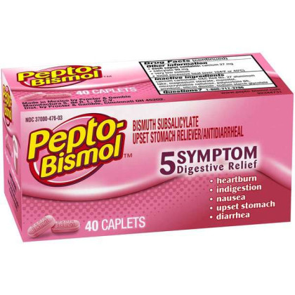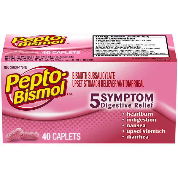 About This Item We aim to show you accurate product information. Manufacturers, suppliers and others provide what you see here, and we have not verified it. See our disclaimer Pepto Bismol Caplets. When you have a sour stomach, Pepto's coating action calms and soothes your symptoms,providing fast digestive relief from nausea, heartburn, indigestion, upset stomach, and diarrhea. Same relief, unflavored caplets. Pepto-Bismol has got you covered. Pepto Bismol Caplets for Nausea, Heartburn, Indigestion, Upset Stomach, and Diarrhea 40 ct: 5 SYMPTOM Digestive Relief: Nausea, Heartburn, Indigestion, Upset Stomach, Diarrhea The #1 Pharmacist Recommended Brand for Upset Stomachs (Based on Pharmacy Times 2018 Survey-upset stomach remedies category) Power of Pepto in a caplet for portable relief Bismuth Subsalicylate Whether you're looking for an upset stomach medicine or nausea help, wondering what to do for ingestion or heartburn relief, or trying to find what's good for diarrhea, Pepto has a coating action to calm and soothe your sour stomach