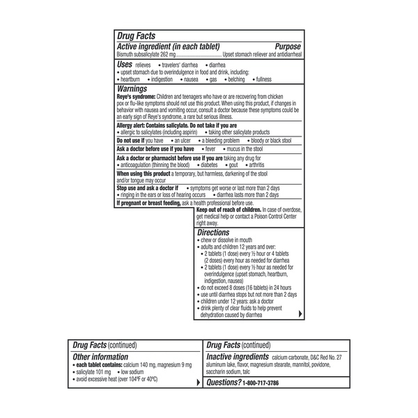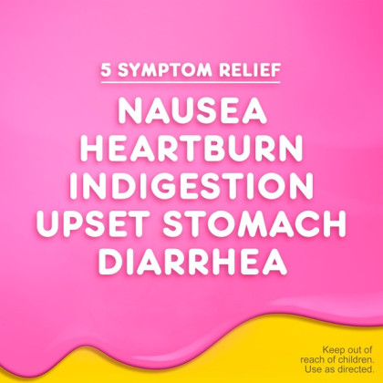 About This Item We aim to show you accurate product information. Manufacturers, suppliers and others provide what you see here, and we have not verified it. See our disclaimer Pepto Bismol Original Chewable Tablets. When you have a sour stomach, Pepto's coating action calms and soothes your symptoms, providing fast digestive relief from nausea, heartburn, indigestion, upset stomach, and diarrhea. Pepto Bismol Chewable Tablets for Nausea, Heartburn, Indigestion, Upset Stomach, and Diarrhea Relief, Original Flavor 30 ct: 5 SYMPTOM Digestive Relief: Nausea, Heartburn, Indigestion, Upset Stomach, Diarrhea The #1 Pharmacist Recommended Brand for Upset Stomachs (Based on Pharmacy Times 2018 Survey-upset stomach remedies category) Power of Pepto in a chewable for portable relief Bismuth Subsalicylate Whether you're looking for an upset stomach medicine or nausea help, wondering what to do for ingestion or heartburn relief, or trying to find what's good for diarrhea, Pepto has a coating action to calm and soothe your sour stomach
