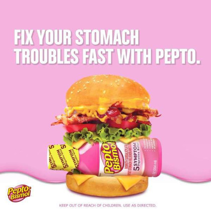 About This Item We aim to show you accurate product information. Manufacturers, suppliers and others provide what you see here, and we have not verified it. See our disclaimer Pepto Bismol Cherry Liquid. When you have a sour stomach, Pepto's improved formula coats your stomach and provides fast relief from nausea, heartburn, indigestion, upset stomach, and diarrhea. Pepto Bismol Liquid for Nausea, Heartburn, Indigestion, Upset Stomach, and Diarrhea Relief, Cherry Flavor 16 oz: 5 SYMPTOM Digestive Relief: Nausea, Heartburn, Indigestion, Upset Stomach, Diarrhea (Packaging may vary) The #1 Pharmacist Recommended Brand for Upset Stomachs (Based on Pharmacy Times 2018 Survey-upset stomach remedies category) Pepto's formula now has improved coating to calm and soothe your stomach Bismuth Subsalicylate Whether you're looking for an upset stomach medicine or nausea help, wondering what to do for indigestion or heartburn relief, or trying to find what's good for diarrhea, Pepto provides fast relief