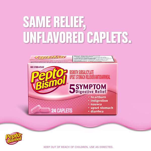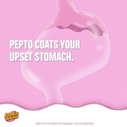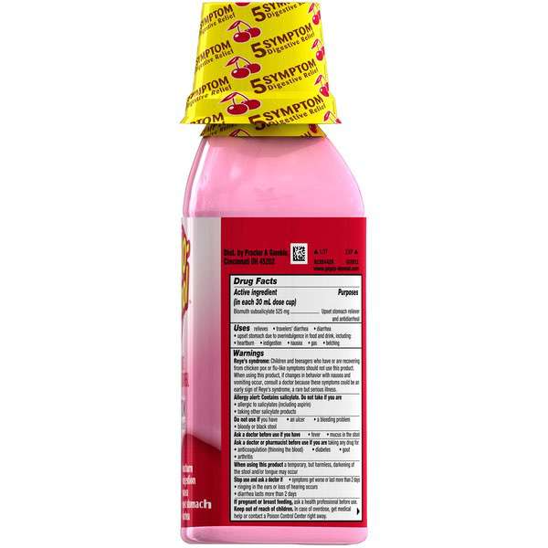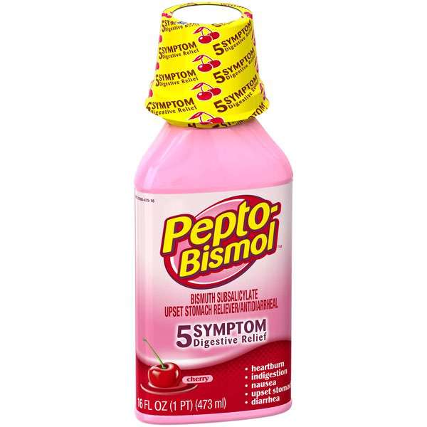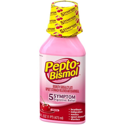 About This Item We aim to show you accurate product information. Manufacturers, suppliers and others provide what you see here, and we have not verified it. See our disclaimer Pepto Bismol Cherry Liquid. When you have a sour stomach, Pepto's improved formula coats your stomach and provides fast relief from nausea, heartburn, indigestion, upset stomach, and diarrhea. Pepto Bismol Liquid for Nausea, Heartburn, Indigestion, Upset Stomach, and Diarrhea Relief, Cherry Flavor 16 oz: 5 SYMPTOM Digestive Relief: Nausea, Heartburn, Indigestion, Upset Stomach, Diarrhea (Packaging may vary) The #1 Pharmacist Recommended Brand for Upset Stomachs (Based on Pharmacy Times 2018 Survey-upset stomach remedies category) Pepto's formula now has improved coating to calm and soothe your stomach Bismuth Subsalicylate Whether you're looking for an upset stomach medicine or nausea help, wondering what to do for indigestion or heartburn relief, or trying to find what's good for diarrhea, Pepto provides fast relief