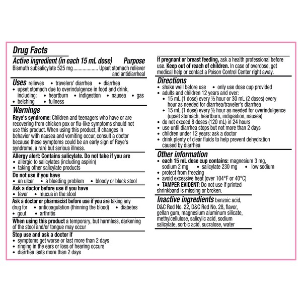 About This Item We aim to show you accurate product information. Manufacturers, suppliers and others provide what you see here, and we have not verified it. See our disclaimer Pepto Bismol Ultra Strength-Original Flavor. When you have a sour stomach, Pepto's improved formula coats your stomach and provides fast relief from nausea, heartburn, indigestion, upset stomach, and diarrhea. Pepto Bismol ULTRA STRENGTH has got you covered. Pepto Bismol Liquid Ultra for Nausea, Heartburn, Indigestion, Upset Stomach, and Diarrhea Relief, Original Flavor 8 oz: 5 SYMPTOM Digestive Relief: Nausea, Heartburn, Indigestion, Upset Stomach, Diarrhea (Packaging may vary) The #1 Pharmacist Recommended Brand for Upset Stomachs (Based on Pharmacy Times 2018 Survey-upset stomach remedies category) Pepto's formula now has improved coating to calm and soothe your stomach Bismuth Subsalicylate Whether you're looking for an upset stomach medicine or nausea help, wondering what to do for indigestion or heartburn relief, or trying to find what's good for diarrhea, Pepto provides fast relief