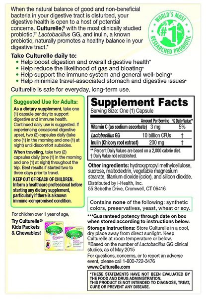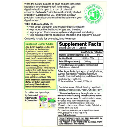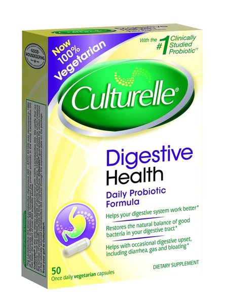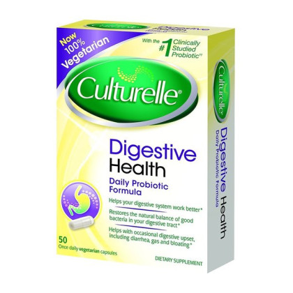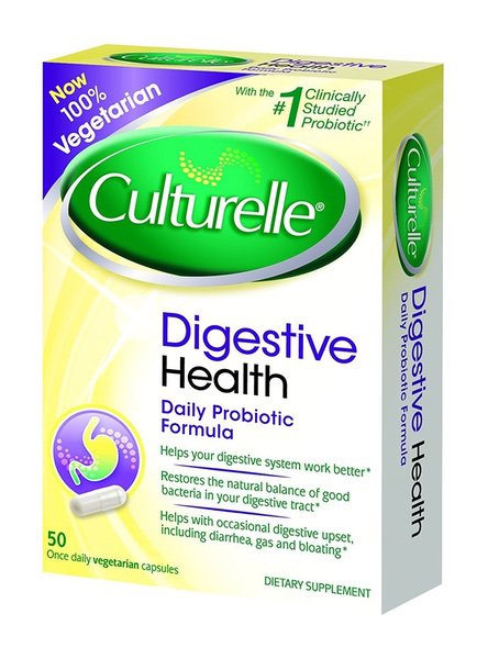 About This Item We aim to show you accurate product information. Manufacturers, suppliers and others provide what you see here, and we have not verified it. See our disclaimer Digestive Health, Once Daily, Vegetarian Capsules Dietary Supplement. Helps your digestive system work better. Restores the natural balance of good bacteria in your digestive tract. Helps with occasional digestive upset, including diarrhea, gas and bloating. With the No. 1 clinically studied probiotic (Based on the number of Lactobacillus GG clinical studies, as of May 2015). Now 100% vegetarian. When the natural balance of good and non-beneficial bacteria in your digestive tract is disturbed, your digestive health is open to a host of potential concerns. Culturelle, with the most clinically studied probiotic (Based on the number of Lactobacillus GG clinical studies, as of May 2015), Lactobacillus GG, and inulin, a known prebiotic, naturally promotes a healthy balance in your digestive tract. Take Culturelle daily to: help boost digestion and overall digestive health; help reduce the likelihood of gas and bloating; help support the immune system and general well-being; help minimize travel-associated stomach and digestive issues. Culturelle is safe for everyday, long term use. No. 1: world's most researched probiotic. Good Housekeeping: Since 1909. Limited warranty to consumers. Replacement or refund if defective. Guarantee of Purity & Potency: The lactobacillus GG strain (Lactobacillus rhamnosus GG - ATCC 53103) was discovered in 1985 at Tufts University in Boston, MA. Considered the premier probiotic in the world, Lactobacillus GG has been the subject of over 100 scientific studies. Culturelle is the only dietary supplement brand with 100% Lactobacillus GG. We certify that our products meet the highest standards of purity and potency. Unlike some products which measure the number of probiotic cultures at time of manufacture, Culturelle guarantees the stated number of live naturally sourced Lactobacillus GG cultures through the expiration date on the package (Guaranteed potency through date on box when stored according to instructions below). Culturelle It's No. 1 for a reason (Nielsen xAOC 52 weeks unit/dollar sales ending 1/23/16). Contains none of the following: synthetic colors, preservatives, yeast, wheat or soy. www.Culturelle.com.For questions, concerns, or to report an adverse event, please call 1-800-722-3476. For children over 1 year of age, Try Culturelle Kids Packets & Chewables! (These statements have not been evaluated by the Food and Drug Administration. This product is not intended to diagnose, treat, cure or prevent any disease.) Country of Origin: USA.