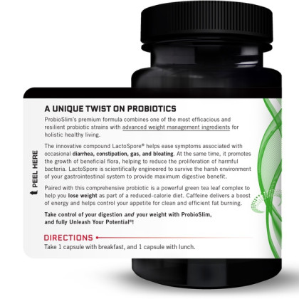 About This Item We aim to show you accurate product information. Manufacturers, suppliers and others provide what you see here, and we have not verified it. See our disclaimer ProbioSlim's premium formula combines one of the most efficacious and resilient probiotic strains with advanced weight management ingredients for holistic healthy living. The innovative compound LactoSpore® helps ease symptoms associated with occasional diarrhea, constipation, gas, and bloating. At the same time, it promotes the growth of beneficial flora, helping to reduce the proliferation of harmful bacteria. LactoSpore is scientifically engineered to survive the harsh environment of your gastrointestinal system to provide maximum digestive benefit. No inconvenient refrigeration, and no need to ingest billions of probiotic cultures, which can actually upset your stomach. Paired with this comprehensive probiotic is a powerful green tea leaf complex to help you lose weight as part of a reduced-calorie diet. Caffeine delivers a boost of energy and helps control your appetite for clean and efficient fat burning. Probiotic Supplement + Fat Burner Promote Healthy Digestion Replenish Good Bacteria Lose Weight
