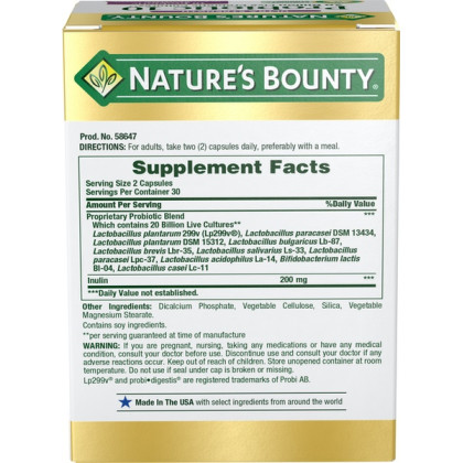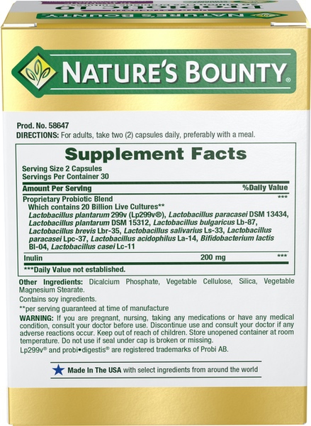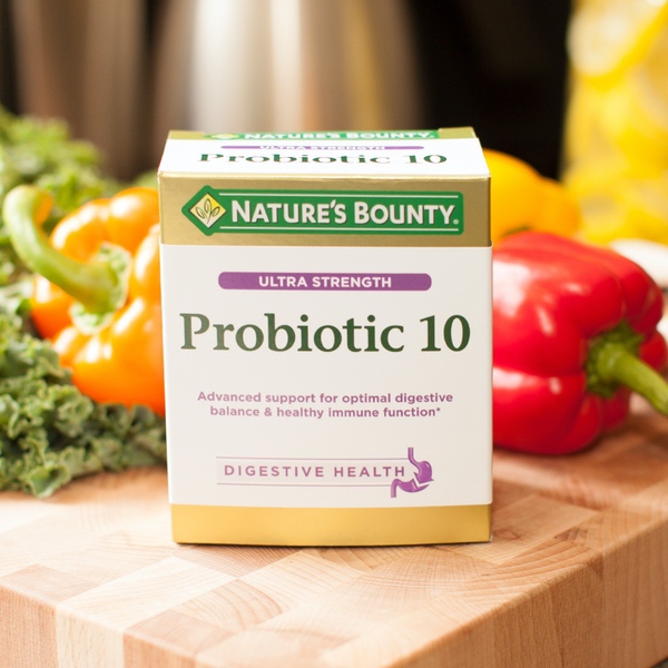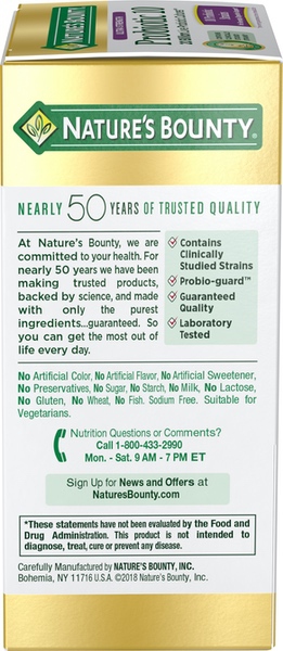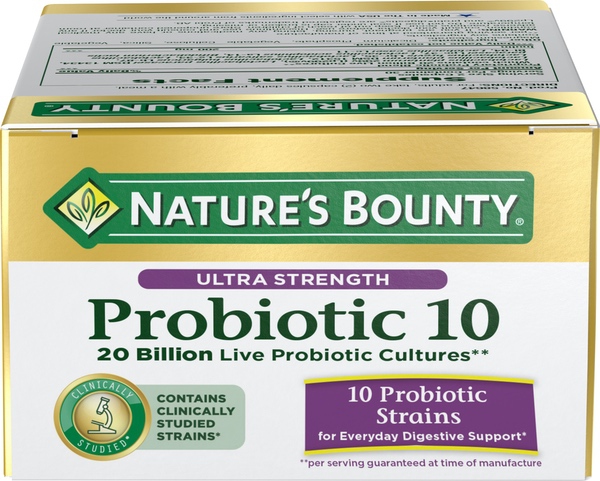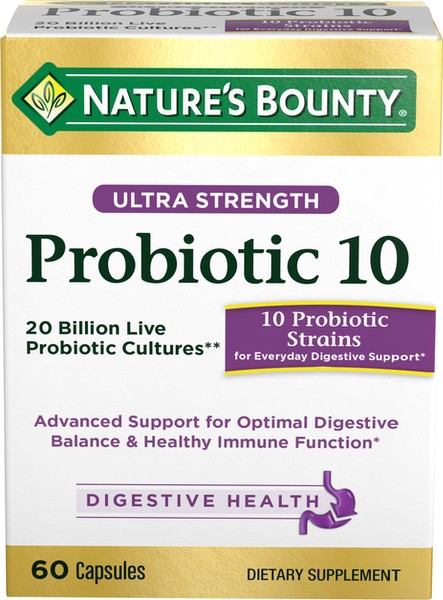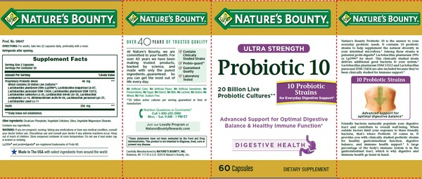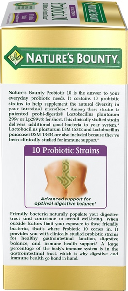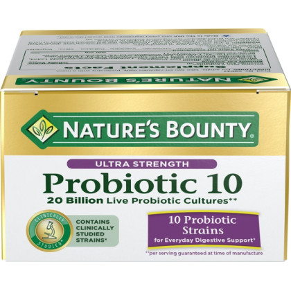 About This Item We aim to show you accurate product information. Manufacturers, suppliers and others provide what you see here, and we have not verified it. See our disclaimer Nature's Bounty Ultra Strength Probiotic 10 contains 10 distinct probiotic cultures to help supplement your body's natural diversity.* These organisms play an active role in aiding the bodyâs natural digestive process.* Nature's Bounty Ultra Strength Probiotic 10 contains 20 billion live probiotic cultures per serving at time of manufacture.* Probiotics not only support microbial balance of healthy intestinal flora, but assist in the bodyâs natural digestive process, and contribute to immune function.* Probiotics help support a favorable environment for the absorption of nutrients.* Nature's Bounty Advanced Probiotic 10 Capsules: Advanced Support for Optimal Digestive Balance & Healthy Immune Function* 20 Billion Live Probiotic Cultures** 10 Probiotic Strains for Everyday Digestive Support* Suitable for Vegetarians Gluten Free *These statements have not been evaluated by the Food and Drug Administration. This product is not intended to diagnose, treat, cure or prevent any disease. Lp299v® and probi•digestis® are registered trademarks of Probi AB. **20 billion active cultures per serving guaranteed at time of manufacture