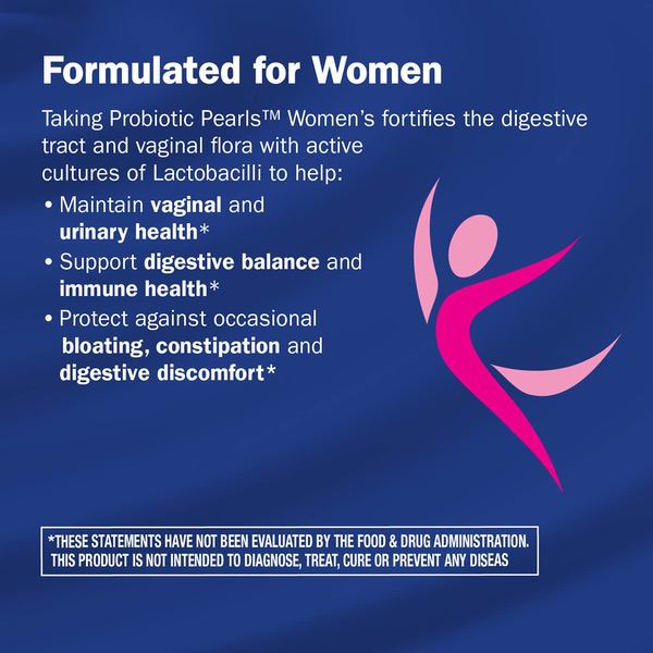 About This Item We aim to show you accurate product information. Manufacturers, suppliers and others provide what you see here, and we have not verified it. See our disclaimer A DAILY PROBIOTIC FOR WOMEN: Probiotic Pearls Women's contain 1 Billion cultures in a convenient, once-daily softgel that's small and easy to swallow. This daily probiotic formula helps support vaginal and digestive health.* FORTIFY THE DIGESTIVE TRACT AND VAGINAL FLORA: Taking Probiotic Pearls Women's fortifies the digestive tract and vaginal flora with active cultures of L. acidophilus, L. rhamnosus and L. plantarum to help maintain yeast balance and vaginal health, support digestive balance and immune health and protect against occasional gas, bloating and constipation.* THE SMARTER PROBIOTIC: Probiotic Pearls Women's uses an advanced triple-layer softgel that protects probiotics from heat, air, moisture and stomach acid to maximize survival and delivery to the intestine. *These statements have not been evaluated by the Food & Drug Administration. These products are not intended to diagnose, treat, cure or prevent any disease. Probiotic Pearls Women's for Digestive and Yeast Balance, 1 Billion Cultures, 30 Count