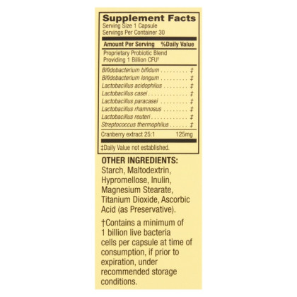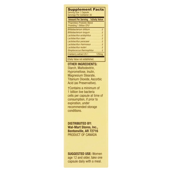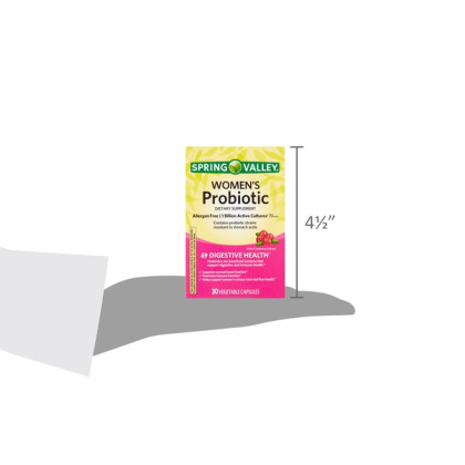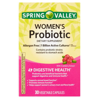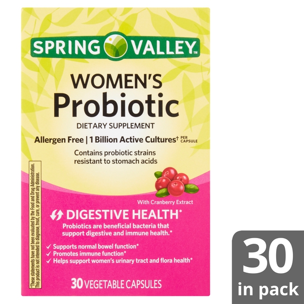 About This Item We aim to show you accurate product information. Manufacturers, suppliers and others provide what you see here, and we have not verified it. See our disclaimer Dietary Supplement 1 billion active cultures† per capsule Digestive health* Probiotics are beneficial bacteria that support digestive and immune health.* ✓ Supports normal bowel function* ✓ Promotes immune function* ✓ Helps support women's urinary tract and flora health* Spring Valley™ Women's Probiotic supports a healthy balance of beneficial bacteria in the digestive system, promoting digestive, urinary and immune health.* For maximum effectiveness, this product has been formulated with probiotic strains that are resistant to stomach acids. ■ Formulated for daily use ■ Naturally supports healthy intestinal flora balance* ■ Provides 1 billion active cultures per capsule† ■ Includes inulin prebiotic fibers that support the growth of good bacteria in the digestive system ■ Contains 8 high potency probiotic strains* What Are Probiotics? The human digestive system is home to trillions of bacteria that perform many helpful functions. However, the healthy balance of good bacteria can be disrupted by diet, travel or stress. Probiotics are beneficial bacteria that can help replenish and support a healthy balance. Probiotic species are different types of bacteria, each of which may provide different health benefits.* †Contains a minimum of 1 billion live bacteria cells per capsule at time of consumption, if prior to expiration, under recommended storage conditions. *These statements have not been evaluated by the Food and Drug Administration. This product is not intended to diagnose, treat, cure, or prevent any disease. Spring Valley Women's Probiotic Vegetable Capsules are specially formulated to promote the digestive, urinary, and immune health of women by supporting a healthy balance of beneficial bacteria in the digestive system. The human digestive system is home to trillions of bacteria that perform helpful functions. Stress, travel, and bad diets can disrupt your body's healthy bacterial balance. These probiotic capsules help support the growth of beneficial bacteria that replenish and support a healthy intestinal flora balance. This product has been formulated with probiotic strains that are resistant to stomach acids for maximum effectiveness. This package includes 30 vegetable capsules with 1 billion active cultures per capsule. With 8 high potency probiotic strains and 125mg of cranberry extract per capsule, you'll be on the path to fantastic health with just one Spring Valley Women's Probiotic Vegetable Capsules per day. Promotes digestive, urinary, and immune health Supports normal bowel function Contains cranberry extract Provides 1 billion active cultures per capsule Resistant to stomach acids No gluten, dairy, or soy Contains prebiotic inulin and 8 probiotic strains 30 vegetable capsules