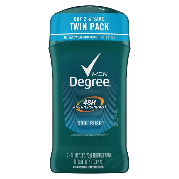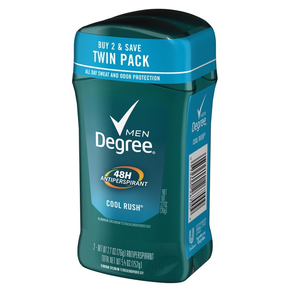 About This Item We aim to show you accurate product information. Manufacturers, suppliers and others provide what you see here, and we have not verified it. See our disclaimer Degree Men Cool Rush helps keep you fresh and dry, no matter what. A men’s antiperspirant that offers 48 hour Original Protection with an energizing burst of crisp, green arctic freshness. Whether you’re having a long day in the office, playing sport outdoors or working out in the gym you can be confident you’ll be protected from sweat and body odor. Designed by experts to be activated by your body heat, Degree Cool Rush is a men’s antiperspirant deodorant stick that works as hard as you do, keeping you dry when you need it most. As well as being highly effective, Degree Cool Rush has an energizing, crisp scent that will keep you fresh all day. Keep comfortable and confident thanks to Degree Cool Rush’s long-lasting formula that is tough on sweat but not on skin. It comes in an easy-to-use applicator stick - you simply turn the dial to raise the stick, apply a thin layer to your underarms and you’re ready for anything. Stay dry, cool and confident thanks to Degree Men Cool Rush. A men’s antiperspirant stick that offers 48 hour Original Protection with an energizing, crisp scent. Body heat activated Degree Men Cool Rush gives you long-lasting protection when you need it the most. Degree. It won’t let you down. Degree Men Cool Rush Antiperspirant Deodorant 5.4 OZ Degree Men Original Protection Antiperspirant Deodorant - Cool Rush 2.7 oz, 2-Pack provides 24-hour body odor and wetness protection that won’t let you down Men's deodorant that is an invisible solid and goes on clear Body Heat Activated Stay dry all day with this deodorant for men Works well for outdoor sports and workouts Powerful, long-lasting sweat and odor protection