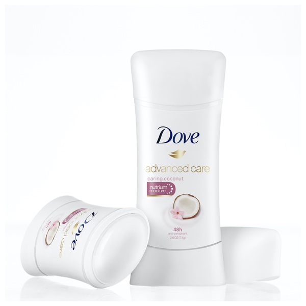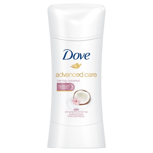 About This Item We aim to show you accurate product information. Manufacturers, suppliers and others provide what you see here, and we have not verified it. See our disclaimer Stay fresh, dry and relaxed every day with Dove Advanced Care Antiperspirant Deodorant Caring Coconut 2.6 oz. Its delicious yet delicate coconut scent is matched with a gentle 0% alcohol (ethanol) formula for soft, smooth underarm skin that stays dry and fresh throughout the day – and the night. You can enjoy excellent underarm care with Dove Caring Coconut. The coconut-scented antiperspirant deodorant formula contains Dove NutriumMoisture and ¼ moisturizers. The formula helps to give soft, smooth underarm skin, and can even help reduce the irritation that frequent shaving may cause. With up to 48 hours of antiperspirant protection, it’ll keep you fresh anywhere, anytime. As with all Dove Advanced Care deodorants, the formula is alcohol (ethanol) free. Dove Caring Coconut Deodorant combines Dove NutriumMoisture and ¼ moisturizers into a formula that’s kind on skin without compromising on antiperspirant protection. To enjoy long-lasting antiperspirant protection that is gentle on skin and beautifully scented with the delicate fragrance of coconut, apply this Dove antiperspirant deodorant after bathing or showering. You’ll get excellent results if your underarm skin is cool and dry and if you give each underarm a few swipes for even coverage. At Dove, our vision is of a world where beauty is a source of confidence, and not anxiety. So, we are on a mission to help the next generation of women develop a positive relationship with the way they look - helping them raise their self-esteem and realize their full potential. Dove Advanced Care Antiperspirant Deodorant Caring Coconut Dove Advanced Care Antiperspirant Deodorant Caring Coconut 2.6 oz, up to 48 hours of antiperspirant protection Contains Dove NutriumMoisture and ¼ moisturizers Can help reduce irritation after shaving Sweet and delicate coconut scented antiperspirant deodorant 0% alcohol (ethanol) formula is kind on skin Dove Advanced Care deodorant glides on easily