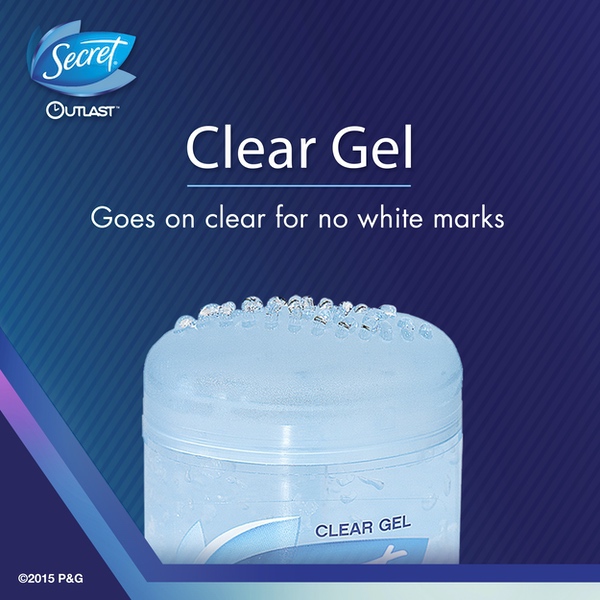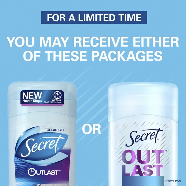 About This Item We aim to show you accurate product information. Manufacturers, suppliers and others provide what you see here, and we have not verified it. See our disclaimer Sweat is the last thing you need to be worried about. Take one worry off of your plate first thing in the morning. With a couple quick swipes, you'll have confidence all day. Secret Outlast fights sweat better* so you get all strength and no sweat for 48 hours. Clear Gel goes on clear for no white marks. When you use Secret, you're getting the peace of mind that your deodorant will work as hard as you do. *Vs. Leading invisible solid Secret Outlast Clear Gel Antiperspirant Deodorant for Women, Protecting Powder 2.6 oz (Pack of 2): Don't waste a moment worrying about sweat. Secret Outlast Antiperspirant Deodorant is all strength, no sweat Be bold! Have confidence that Outlast fights sweat better than the leading invisible solid Get 48 hour protection that never stops and get on with your day Clear Gel goes on clear for no white marks Protecting Powder is the soft scent that protects you against odor all day