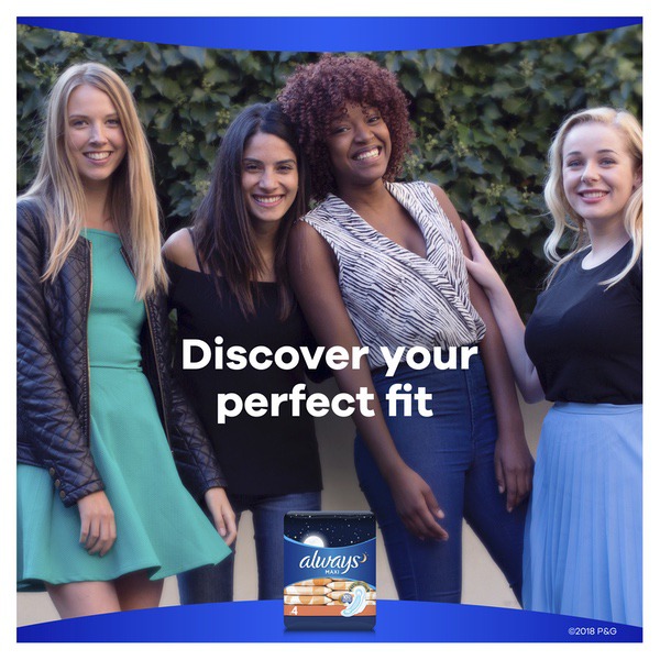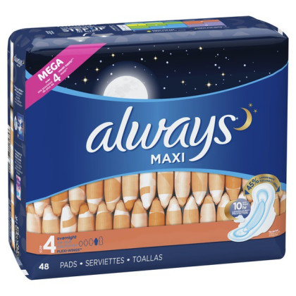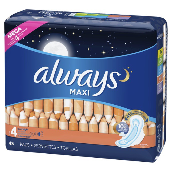About This Item We aim to show you accurate product information. Manufacturers, suppliers and others provide what you see here, and we have not verified it. See our disclaimer Are you getting the right protection from your pad? Did you know that 60% of women are wearing the wrong size pad? Using the wrong pad size can lead to leaks. Step up in size to help stop leaks. Now you can find your fit with ALWAYS My Fit, a tailored sizing system to help you find the best protection based on both your flow AND panty size. Use the sizing chart in the images to find your fit for day and night. For overnight protection, ALWAYS Maxi, Size 4, Overnight Pads With Flexi-Wings have a 45% larger back to help stop leaks at night*, plus a LeakGuard Core that absorbs in seconds and gives you up to 10 hours of protection with a fresh scent. *Vs. ALWAYS Maxi Regular With Flexi-Wings ALWAYS Maxi Size 4 Overnight Pads With Wings Unscented, 48 Count: Did you know that 60% of women are wearing the wrong size pad? This can lead to leaks. Step up in size to help stop leaks ALWAYS My Fit helps you get the best protection by tailoring your pad to fit your flow AND panty size. Use the sizing chart in the images to find your fit LeakGuard Core absorbs in seconds for up to 10 hours of protection Provides 45% larger back to help stop leaks at night* (*Vs. ALWAYS Maxi Regular With Wings) ALWAYS Maxi, Size 4, Overnight Pads With Wings have a flexible design for ALWAYS' best nighttime protection ALWAYS gives puberty education and pads to millions of girls around the world to help them stay confident
