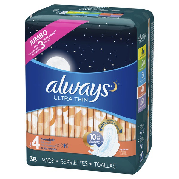 About This Item We aim to show you accurate product information. Manufacturers, suppliers and others provide what you see here, and we have not verified it. See our disclaimer Are you getting the right protection from your pad? Did you know that 60% of women are wearing the wrong size pad? Using the wrong pad size can lead to leaks. Step up in size to help stop leaks. Now you can find your fit with ALWAYS My Fit, a tailored sizing system to help you find the best protection based on both your flow AND panty size. Use the sizing chart in the images to find your fit for day and night. For overnight protection, ALWAYS Ultra Thin, Size 4, Overnight Pads With Flexi-Wings have a 45% larger back to help stop leaks at night*, plus a LeakGuard Core that absorbs in seconds and gives you up to 10 hours of protection with a fresh scent. *Vs. ALWAYS Ultra Thin Regular With Flexi-Wings ALWAYS Ultra Thin Size 4 Overnight Pads With Wings Unscented, 38 Count: Did you know that 60% of women are wearing the wrong size pad? This can lead to leaks. Step up in size to help stop leaks ALWAYS My Fit helps you get the best protection by tailoring your pad to fit your flow AND panty size. Use the sizing chart in the images to find your fit LeakGuard Core absorbs in seconds for up to 10 hours of protection Provides 45% larger back to help stop leaks at night* (*Vs. ALWAYS Ultra Thin Regular With Wings) ALWAYS Ultra Thin, Size 4, Overnight Pads With Wings have a flexible design for ALWAYS' best nighttime protection ALWAYS gives puberty education and pads to millions of girls around the world to help them stay confident