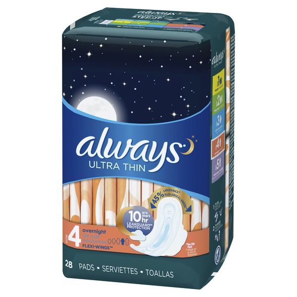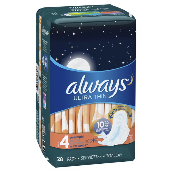 About This Item We aim to show you accurate product information. Manufacturers, suppliers and others provide what you see here, and we have not verified it. See our disclaimer Are you getting the right protection from your pad? Did you know that 60% of women are wearing the wrong size pad? Using the wrong pad size can lead to leaks. Step up in size to help stop leaks. Now you can find your fit with ALWAYS My Fit, a tailored sizing system to help you find the best protection based on both your flow AND panty size. Use the sizing chart in the images to find your fit for day and night. For overnight protection, ALWAYS Ultra Thin, Size 4, Overnight Pads With Flexi-Wings have a 45% larger back to help stop leaks at night*, plus a LeakGuard Core that absorbs in seconds and gives you up to 10 hours of protection with a fresh scent. *Vs. ALWAYS Ultra Thin Regular With Flexi-Wings ALWAYS Ultra Thin Size 4 Overnight Pads With Wings Unscented, 38 Count: Did you know that 60% of women are wearing the wrong size pad? This can lead to leaks. Step up in size to help stop leaks ALWAYS My Fit helps you get the best protection by tailoring your pad to fit your flow AND panty size. Use the sizing chart in the images to find your fit LeakGuard Core absorbs in seconds for up to 10 hours of protection Provides 45% larger back to help stop leaks at night* (*Vs. ALWAYS Ultra Thin Regular With Wings) ALWAYS Ultra Thin, Size 4, Overnight Pads With Wings have a flexible design for ALWAYS' best nighttime protection ALWAYS gives puberty education and pads to millions of girls around the world to help them stay confident