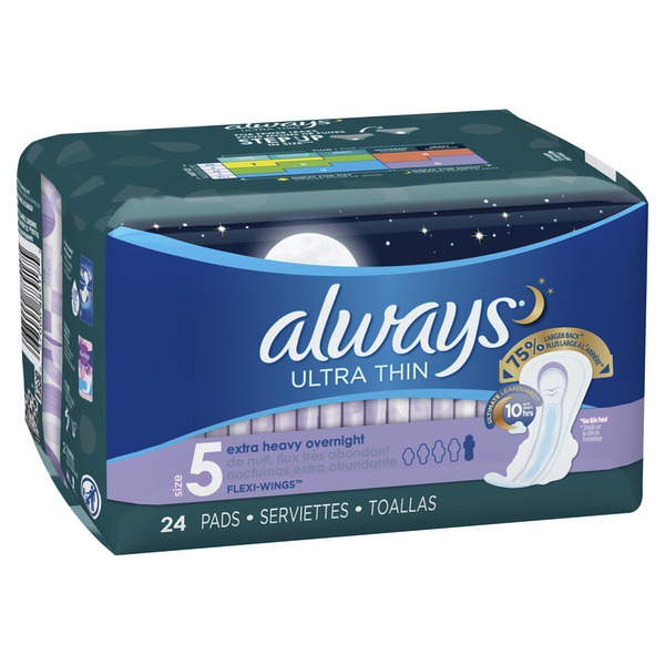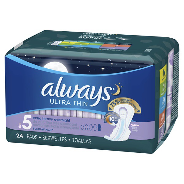 About This Item We aim to show you accurate product information. Manufacturers, suppliers and others provide what you see here, and we have not verified it. See our disclaimer Are you getting the right protection from your pad? Did you know that 60% of women are wearing the wrong size pad? Using the wrong pad size can lead to leaks. Step up in size to help stop leaks. Now you can find your fit with ALWAYS My Fit, a tailored sizing system to help you find the best protection based on both your flow AND panty size. Use the sizing chart in the images to find your fit for day and night. For our best nighttime protection, ALWAYS Ultra Thin, Size 5, Extra Heavy Overnight Pads With Flexi-Wings have a 75% larger back to help stop leaks at night,* plus a LeakGuard Core that absorbs in seconds and gives you up to 10 hours of protection. *vs. ALWAYS Ultra Thin Regular With Flexi-Wings ALWAYS Ultra Thin Size 5 Extra Heavy Overnight Pads With Wings Unscented, 46 Count: Did you know that 60% of women are wearing the wrong size pad? This can lead to leaks. Step up in size to help stop leaks ALWAYS My Fit helps you get the best protection by tailoring your pad to fit your flow AND panty size. Use the sizing chart in the images to find your fit LeakGuard Core absorbs in seconds for up to 10 hours of protection Provides 75% larger back to help stop leaks at night* (*Vs. ALWAYS Ultra Thin Regular with Wings) for ALWAYS' best nighttime protection, ALWAYS Ultra Thin, Size 5, Extra Heavy Overnight Pads With Wings have a flexible design for ALWAYS' best nighttime protection ALWAYS gives puberty education & pads to millions of girls around the world to help them stay confident!