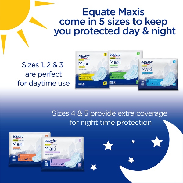 About This Item We aim to show you accurate product information. Manufacturers, suppliers and others provide what you see here, and we have not verified it. See our disclaimer Equate Maxi Pads with Flexi-Wings, Extra Heavy Overnight stops leaks up to 10 hours with the help of three layers of protection. These maxi pads have a skinfresh breathable layer that allows you to stay fresh and dry providing you with all day comfort. The absorbent core allows you 10 hours of worry free protection and has a cotton enhanced layer that wicks away moisture for healthy skin. They come individually wrapped for convenient and discreet access in your purse, gym bag, or cosmetic bag. Equate maxi pads have many qualities that help you have a comfortable and healthy period. The simple choice for periods is Equate Maxi Pads with Flexi-Wings, Extra Heavy Overnight. Making the right health decisions can be challenging. Equate allows you to take care of your family with confidence. Equate Maxi Pads with Flexi-Wings, Extra Heavy Overnight, Size 5, 20 Count: Up to 10 hours leakage protection Cotton enhanced layer Absorbent core
