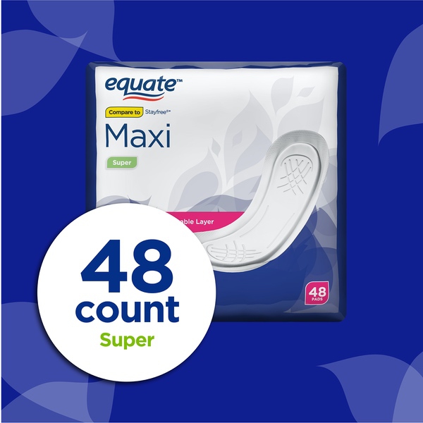 About This Item We aim to show you accurate product information. Manufacturers, suppliers and others provide what you see here, and we have not verified it. See our disclaimer Stay comfortable all day with these Equate Maxi Pads. They make it easier for you to get through heavy flow days. The absorbent core helps lock away liquid while the Omni-OdorGuard controls odors. Each one is individually wrapped for your convenience. These super-absorbent pads come in a handy 48-count pack. Making the right health decisions can be challenging. With a complete range of products and simple solutions, Equate allows you to take care of your family with confidence. Equate Super Multi-Channel Maxi Pads, 48-Count: Maxi pads feature cotton-soft cover for extra comfort and protection Absorbent core helps manage flow better Easy to use, simple to remove Designed for heavy-flow days to keep you dry and confident Over 1" longer than our regular multi-channel maxi Profiled shape helps to make the fit secure and comfortable Adhesive prevents shifting Omni-OdorGuard
