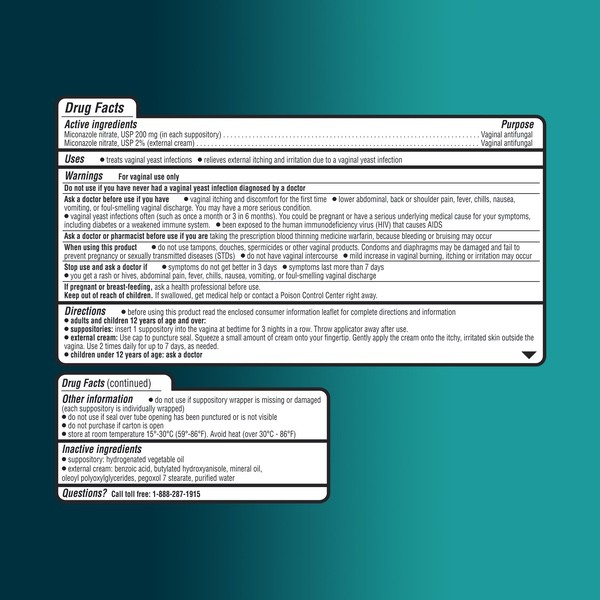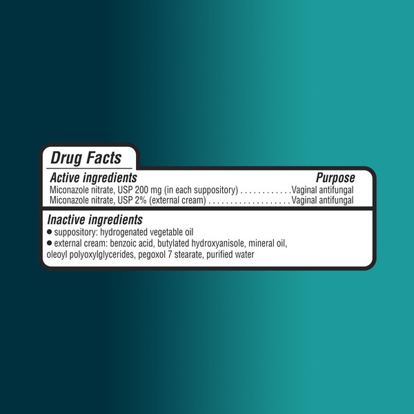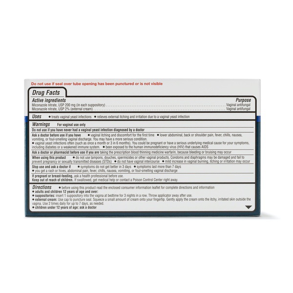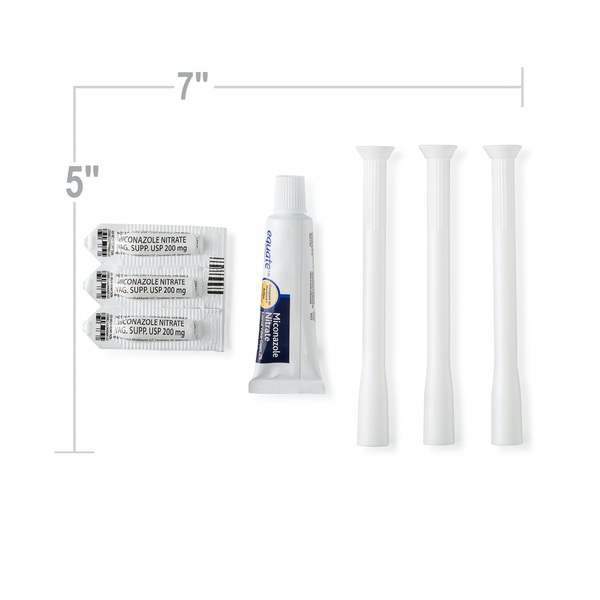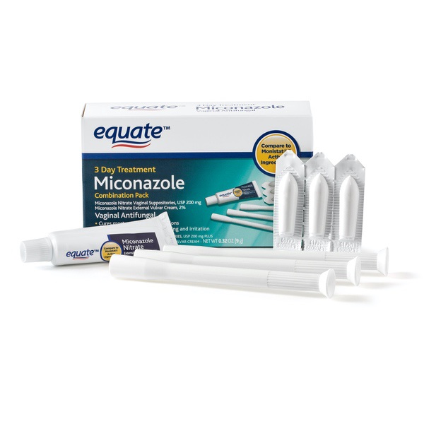 About This Item We aim to show you accurate product information. Manufacturers, suppliers and others provide what you see here, and we have not verified it. See our disclaimer Deal with itchy skin problems fast with Equate Miconazole cream. This product is specially formulated to treat most yeast infections in three days. This Miconazole cream contains 200mg per treatment to get rid of discomfort and itchiness fast. It is made to effectively cure most vaginal yeast infections, while providing immediate relief of symptoms. The Equate three-day treatment Miconazole pack contains three suppositories and one tube of 200mg external vulvar cream for easy application and quick results. It compares to Monistat 3. This product is suited for adults and children 12 years of age and over. To use, insert one suppository at bedtime for three nights in a row. Throw the applicator away after use. Get the relief you need with Equate Miconazole Vaginal Antifungal Treatment. Making the right health decisions can be challenging. With a complete range of products and simple solutions, Equate allows you to take care of your family with confidence. Equate Miconazole Vaginal Antifungal 3-Day Treatment, 200 mg: Vaginal antifungal cream effectively treats most yeast infections 1 pack contains 3-day treatment Miconazole of 200mg external vulvar cream 3 suppositories provide easy application Miconazole cream gets rid of discomfort and itchiness fast Compares to Monistat 3 active ingredients For adults and children 12 years of age and older Treats vaginal yeast infections; relieves external itching and irritation Stop using if symptoms do not get better in 3 days or if symptoms last more than 7 days Insert 1 suppository into the vagina at bedtime for 3 nights in a row; throw applicator away after use Use a small amount of cream to apply on the itchy and irritated skin outside