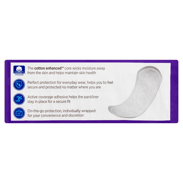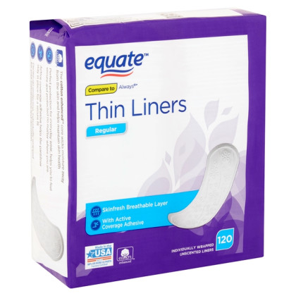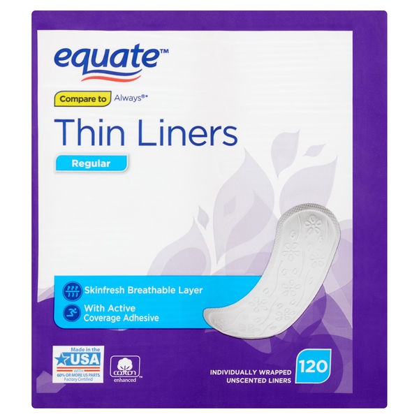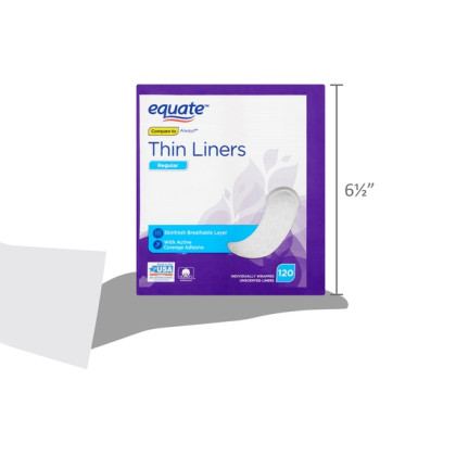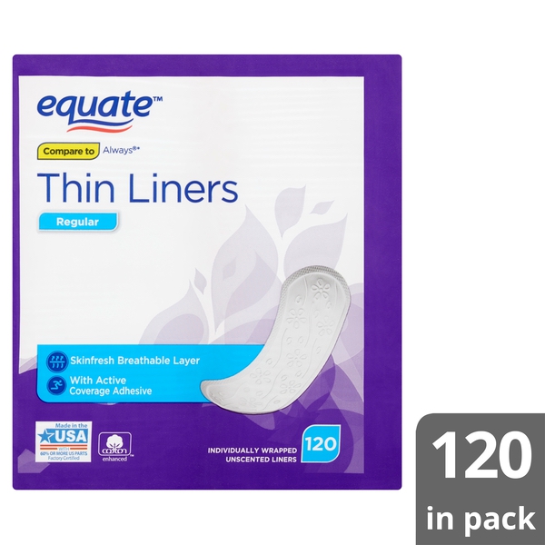 About This Item We aim to show you accurate product information. Manufacturers, suppliers and others provide what you see here, and we have not verified it. See our disclaimer Perfect protection for everyday wear, helps you to feel secure and protected no matter where you are Active coverage adhesive helps the pantiliner stay in place for a secure fit On-the-go protection, individually wrapped for your convenience and discretion Stay fresh and dry with Equate Regular Thin Unscented Liners. The thin, absorbent pads in this 120-count package are individually wrapped for your convenience and discretion. Their advanced active coverage adhesive helps each pantiliner stay in place for a secure fit, providing effective protection for everyday wear. The cotton-enhanced™ core wicks moisture away from the skin for a dry feeling, giving you peace of mind no matter where you are or what you're doing. Equate Regular Thin Unscented Liners help you to be active, secure, and worry-free. Your family's health is one of the most important priorities in your life. Walmart's Equate Brand is now the innovative leader in the health, beauty, and personal care marketplace and is outperforming and exceeding the quality standards of many national brands. The Equate brand has everything you need to keep your whole family feeling their best. Whether it's pain relief medication for unexpected situations or superior, tested products for hair or skin care, Equate has you covered. With our Every Day Low Prices, it's easy to stock your bathroom cabinet with premium-quality essentials, even when you're on a budget! For everything from vitamins and supplements, to first aid and feminine care products, you can confidently rely on the Walmart Equate brand to help you care for your family, every day. Breathable layer Active coverage adhesive 120 individually wrapped liners Unscented