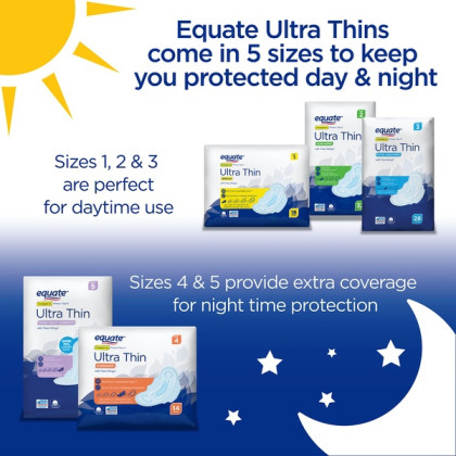 About This Item We aim to show you accurate product information. Manufacturers, suppliers and others provide what you see here, and we have not verified it. See our disclaimer Equate Overnight Ultra Thin Pads with Flexi-Wings stop leaks up to 10 hours with the help of three layers of protection. These pads have a skinfresh breathable layer that allows you to stay fresh and dry, providing you with all day comfort. The absorbent core allows you 10 hours of worry-free protection and the cotton enhanced layer wicks away moisture for healthy skin. They are individually wrapped for convenient and discreet access in your purse, gym bag, or cosmetic bag. Equate pads help you have a comfortable and healthy period. The simple choice for periods is Equate Overnight Ultra Thin Pads with Flexi-Wings. Making the right health decisions can be challenging. With a complete range of products and simple solutions, Equate allows you to take care of your family with confidence. Equate Ultra Thin Pads with Flexi-Wings, Overnight, Size 4, 38 Count: 3 layers of protection Absorbent core offers 10 hours of protection Cotton enhanced layer wicks away moisture Skinfresh breathable layer leaves you feeling fresh and dry Individually wrapped for convenient and discreet access