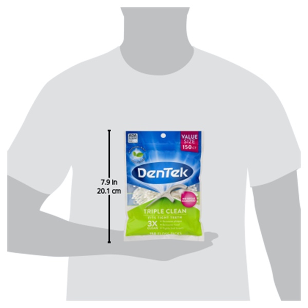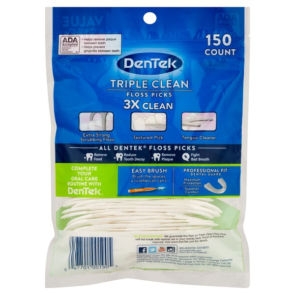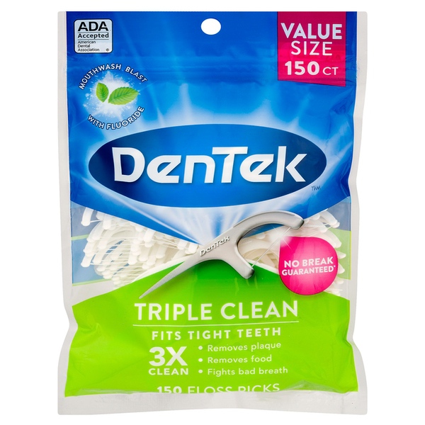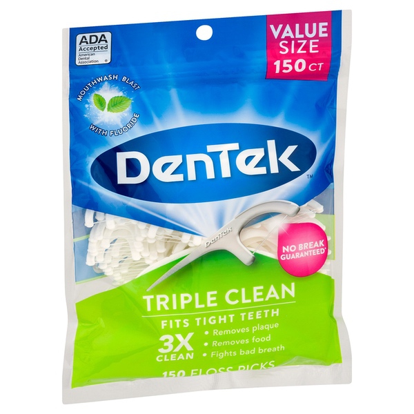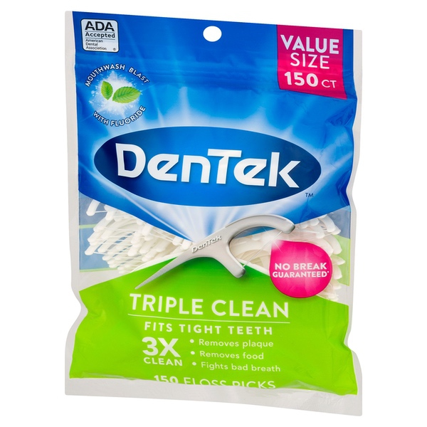 About This Item We aim to show you accurate product information. Manufacturers, suppliers and others provide what you see here, and we have not verified it. See our disclaimer • Scrubs between tight teeth and stimulates gums • Textured pick deep cleans between teeth to remove food and plaque • Super-strong floss is guaranteed not to break, even when used on the tightest teeth • Tongue cleaner fights bad breath with a minty flavor • Advanced fluoride coating on each pick DenTek Triple Clean Floss Picks feature scrubbing floss to remove food and plaque, a textured pick to deep clean between teeth and a built-in tongue scraper to keep breath fresh. Featuring a No Break Guarantee, DenTek Triple Clean Floss Picks help keep your whole mouth healthy. Conventional dental floss can't always remove food and plaque in hard-to-reach interdental spaces. Try DenTek Triple Clean Floss Picks when you need to remove food and plaque after eating. Dentists recommend flossing to prevent cavities, gum disease and other dental health problems. Help protect your teeth against stains and decay by flossing after every meal. When used after every meal, DenTek Triple Clean Floss Picks help to remove food and plaque, reduce the chance of tooth staining and decay, and fight bad breath. Get DenTek Floss Picks to help you show off your healthy smile, and get triple the protection of traditional rolled floss.