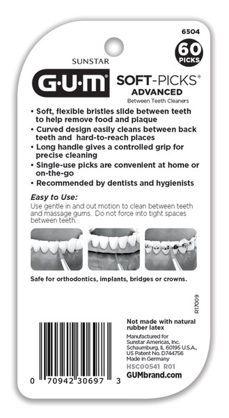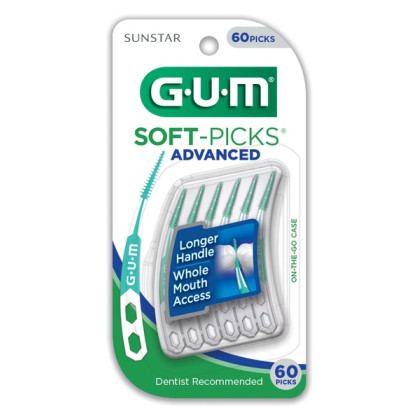 About This Item We aim to show you accurate product information. Manufacturers, suppliers and others provide what you see here, and we have not verified it. See our disclaimer GUM® Soft-Picks® Advanced have flexible, comfortable bristles to gently remove plaque, dislodge food and massage gums. The flexible synthetic rubber bristles fit easily between most teeth, removing dental plaque where gum disease often starts and toothbrushes alone cannot reach. The curved design of Soft-Picks ® Advanced allows the picks to easily reach any area of the mouth, including difficult to reach back teeth for a whole mouth clean!