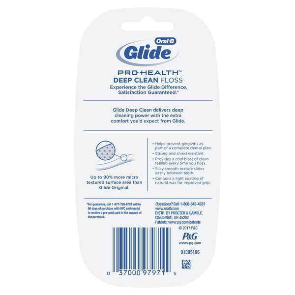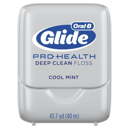 About This Item We aim to show you accurate product information. Manufacturers, suppliers and others provide what you see here, and we have not verified it. See our disclaimer Oral-B Glide Pro-Heath Deep Clean Floss helps remove plaque between teeth and below the gum line with a cool burst of clean feeling. The silky-smooth, shred resistant texture slides up to 50% more easily in tight spaces vs. regular floss. Satisfaction Guaranteed, or your money back. For guarantee, call 1-877-769-8791 within 60 days of purchase with UPC and receipt. Oral-B Glide Pro-Health Deep Clean Dental Floss, Cool Mint, 40 m, Pack of 3: Up to 90% more micro textured surface area than Glide Original Slides up to 50% more easily vs. regular floss Helps prevent gingivitis as part of a complete dental plan Provides a cool blast of clean feeling every time you floss Silky smooth texture slides easily between teeth Contains a light coating of natural wax for improved grip Oral-B, #1 Dentist Recommended Brand