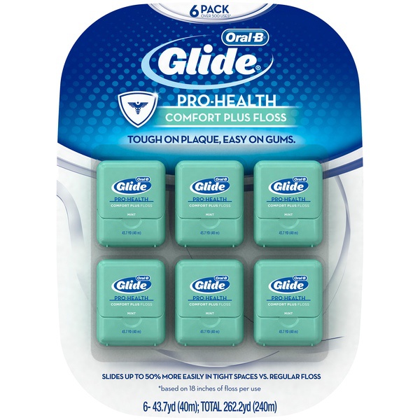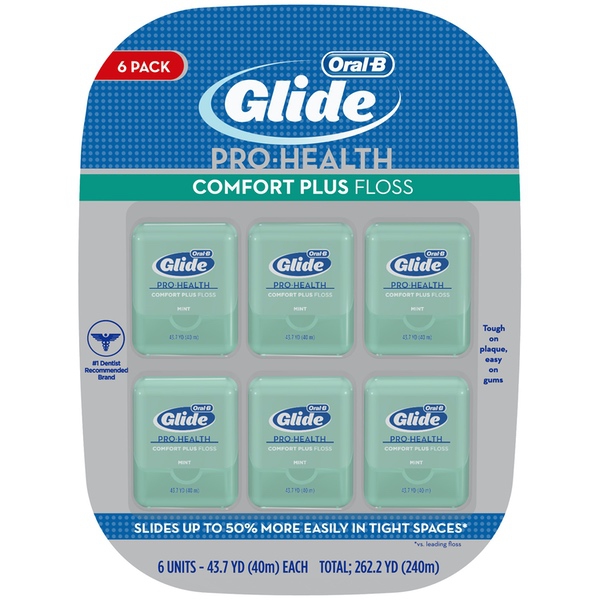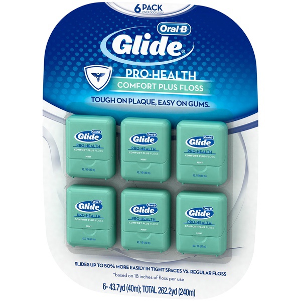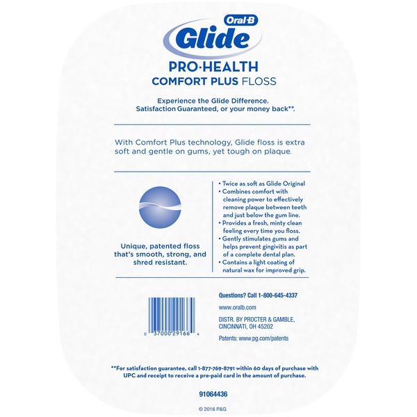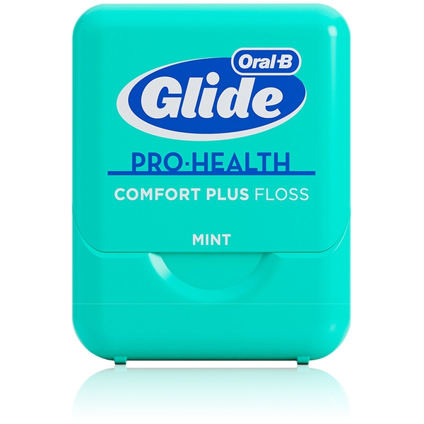 About This Item We aim to show you accurate product information. Manufacturers, suppliers and others provide what you see here, and we have not verified it. See our disclaimer Oral-B Glide Pro-Heath Comfort Plus Floss is extra soft and gentle on gums, yet tough on plaque. Experience the Glide difference with this unique floss that's smooth, strong, and shred resistant. Satisfaction Guaranteed, or your money back. For guarantee, call 1-877-769-8791 within 60 days of purchase with UPC and receipt. Slides up to 50% more easily vs. regular floss Combines comfort with cleaning power to effectively remove plaque between teeth and just below the gum line Gently stimulates gums and helps prevent gingivitis as part of a complete dental plan; Contains a light coating of natural wax for improved grip Soft on gums, hard on plaque; Mint flavor