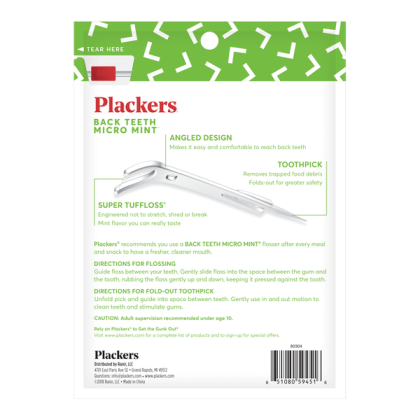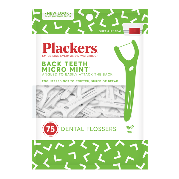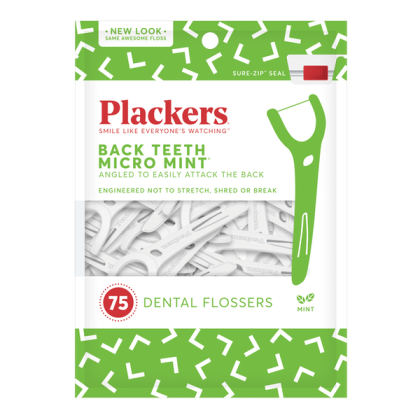 About This Item We aim to show you accurate product information. Manufacturers, suppliers and others provide what you see here, and we have not verified it. See our disclaimer The Plackers Back Teeth Micro Mint Dental Floss Picks utilize a unique angled design to easily reach your back teeth to make flossing a breeze while ensuring your smile is always ready to shine. Plackers Back Teeth Micro Mint dental flossers are manufactured with Super Tuffloss, the world’s strongest dental floss, engineered not to shred, break, or stretch while providing a seamless and comfortable experience time after time. Who has time for traditional flossing when Plackers Back Teeth Micro Mint Dental Floss Picks make it so easy and fun? Contained within the handle is a fold away toothpick to provide a convenient method for additional plaque and food debris removal while the minty flavored floss always leaves your mouth feeling refreshed and super clean. Flossing your back teeth can be a tough job, but these floss picks make it easy with the angled head design that comfortable reaches the back of your mouth. Whether you're at home or on the go, Back Teeth Micro Mint Dental Flossers are perfect for when a toothbrush, toothpaste, and sink are not readily available. Throw a pack in the car; leave one in the top drawer of your desk at the office; keep one in your purse or hand bag, backpack, or travel bag; and of course in a cup on the vanity of your bathroom. Keep your smile shining with Plackers Back Teeth Micro Mint Dental Floss Picks! Since pioneering the first dental flosser, patented over 40 years ago, Plackers has helped brighten the smiles of millions with our complete suite of dental products: We know your smile is important to you, so let us help you keep it clean and healthy! 75 Count (Pack of 4) Plackers Back Teeth Micro Mint Flossers makes flossing a breeze Engineered not to shred, break, or even stretch by utilizing the world’s strongest dental floss, Super Tuffloss Unique angled design comfortably reaches and cleans the back teeth Removes additional plaque and food debris in tough to reach areas with protected tartar pick in handle Minty flavor leaves your mouth and gums feeling clean and refreshed Great for at home or on-the-go dental care Make flossing a breeze and ensure your smile shines