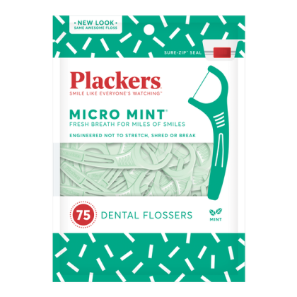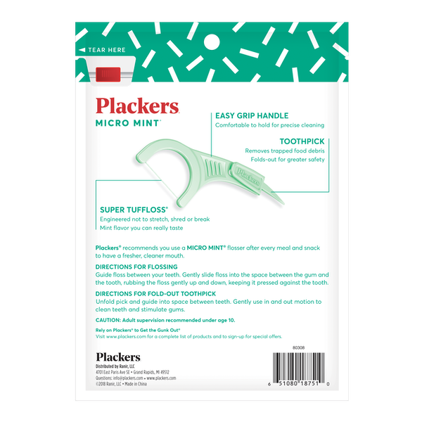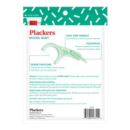 About This Item We aim to show you accurate product information. Manufacturers, suppliers and others provide what you see here, and we have not verified it. See our disclaimer Plackers Micro Mint Flossers are mint flavored dental floss picks that leave your mouth feeling fresh and clean each time you floss. Our flossers feature the world’s strongest floss. Super Tuffloss Hi-Performance floss is engineered to not stretch, shred or break, while gliding through even the tightest teeth with ease. Traditional fiber floss causes discomfort for some users and can be unsanitary while sticking dirty fingers in your mouth. Plackers Micro Mint flossers are gentle on your gums, removing plaque and debris without needing a mirror. Keep these easy flossers in your pocket, purse, desk or car for a quick floss on the move and smile with confidence. Flossing teeth once a day is recommended and Plackers Flossups make it easy to maintain a good dental hygiene routine. The patented fold-away, protected pick on our floss picks is ready when you need it, and is not a nuisance when you don’t. Stay prepared with Plackers dental flossers! So, how often you should floss? Dental flossing between teeth once a day is preferred. Maintaining good oral health is not only important for keeping your teeth and gums healthy, but it is key to overall health. According to the American Dental Association, more than 500 bacterial species are found in plaque*. Plackers flossers can reduce the bad bacteria hiding in your mouth. Flossing with a product like Plackers Micro Mint Flossers reduces your chances of gum disease and cavities, and removes plaque from the areas where a toothbrush can’t reach. Flossups easily reach difficult back teeth and the fold-away, protected pick attached to the flosser gently removes plaque and food debris from your teeth and gums. Disposable flossers can be easier to use than traditional fiber floss if you suffer from arthritis or other conditions that compromise the dexterity in your hands and fingers. Don’t let a change in your life cause you to miss out on the benefits of flossing. If you or a loved one has difficulty with traditional floss, Plackers Micro Mint floss picks offer a great option for maintaining oral health with the use of just one hand. We have engineered our flossers with Super Tuffloss technology, the world’s strongest floss. Plackers flossers are engineered to not stretch, shred or break, even with the tightest of teeth. Our floss uses a patented design, making Plackers flossers easier and more comfortable to use compared to traditional dental floss. The cool mint flavor in our floss picks leaves your mouth feeling fresh and clean. It’s okay if you are just learning how to floss. Don’t let another day pass without properly flossing your teeth. Purchase Plackers Micro Mint Flossers today and find your best flossing routine. Caution: Adult supervision recommended under age 10. 36 Count Easy-to-use flossers for your teeth Plackers Flossups you can use around your sensitive gums Flossing tools for interdental cleaning Plackers Micro Mint Flossers leave your mouth minty fresh Disposable dental floss picks for your teeth Flossups with fold-away protected pick Floss picks for convenient and sanitary dental hygiene maintenance