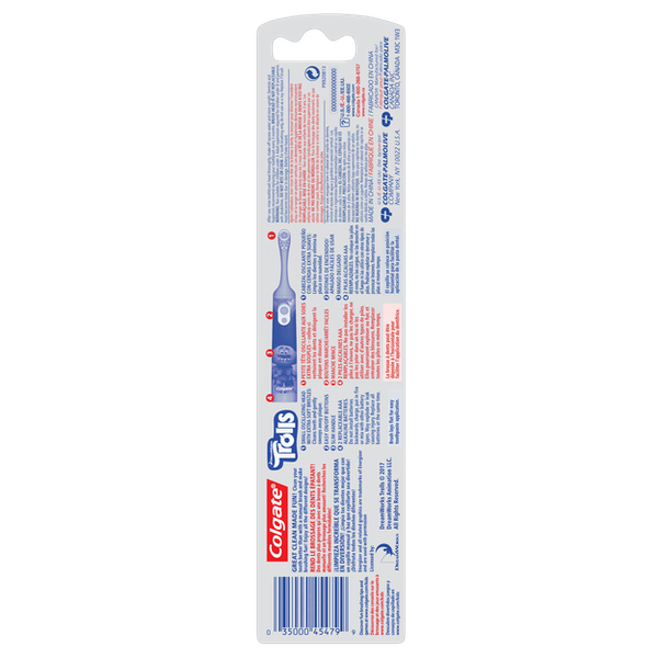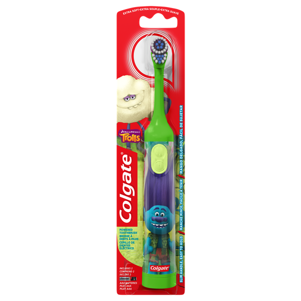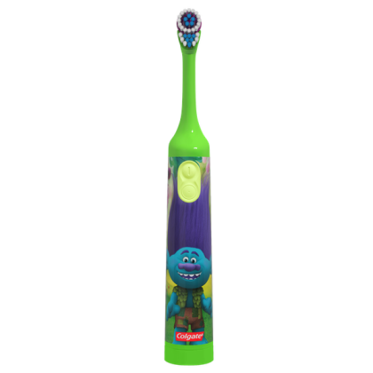 About This Item Warning - Choking Hazard - Children Under 3 This toy is not suitable for ages under 3 years. It contains one or more of the following items marbles; small ball; or small parts. We aim to show you accurate product information. Manufacturers, suppliers and others provide what you see here, and we have not verified it. See our disclaimer This Colgate Kid's Battery-Powered Toothbrush makes cleaning teeth fun. It's ideal for young children who are learning about proper oral care. The Colgate toothbrush features a printed graphic of a character from the popular animated film "Trolls." It features a unique design with a small, oscillating head that gently sweeps away plaque for healthier teeth. This kid's toothbrush has extra-soft bristles for more comfortable brushing. It also has a slim handle that's easy for small hands to hold. This toothbrush is battery powered. It lies flat to allow children to more easily apply toothpaste. The brush plays the character's voice to help coach your child through the brushing process. It tells children when to brush a new quadrant of the mouth and congratulates the user after two minutes of brushing. This makes the toothbrush ideal for encouraging young children to develop good brushing habits. This Colgate Kid's Battery-Powered Toothbrush is available in other colors and designs, so Colgate Kid's Battery-Powered Toothbrush Trolls (Colors Vary): Picture of a character from the film "Trolls" Character's voice coaches user through the brushing process Congratulates you after 2 minutes of brushing Colgate toothbrush designed for small children Small, oscillating head sweeps away plaque Slim handle for small hands Extra-soft bristles for greater comfort Battery powered Helps encourage children to maintain proper oral care