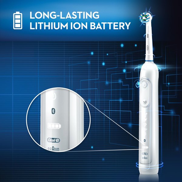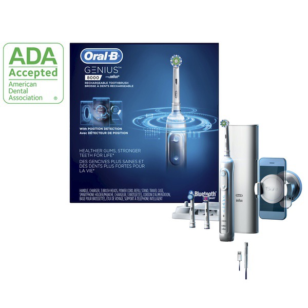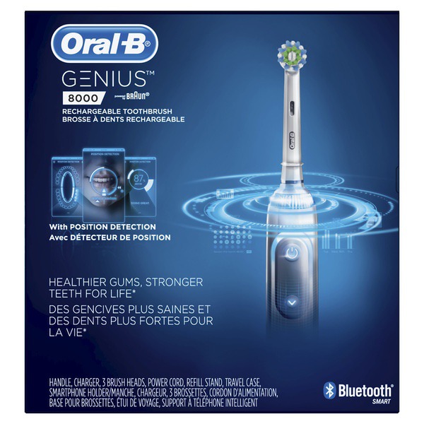 About This Item We aim to show you accurate product information. Manufacturers, suppliers and others provide what you see here, and we have not verified it. See our disclaimer Use the Oral-B App to seamlessly pair your Genius 8000 with a smartphone and you're on your way to brushing like your dentist recommends. The Oral-B Genius 8000 comes with Position Detection technology which uses Bluetooth technology, your smartphone, and facial recognition technology to provide you with real-time feedback about your brushing habits. The 360 SmartRing with LED lights allows you to personalize your brushing experience with your choice of 12 colors. The SmartRing works with the integrated timer and pressure sensor to provide you with visual feedback on brushing time and brushing pressure. Together, they help you ensure you brush for the recommended 2-minutes while making sure you brush with appropriate pressure to protect your gums from over-brushing. The premium Smart Travel Case lets you charge your brush and smartphone (via USB) at the same time while using only one wall plug. The Genius features 6 brushing modes so you can further customize your brushing experience based on your specific oral care goals. This highly advanced brush features a dentist-inspired round head that surrounds and cups each tooth with dynamic oscillating, rotating and pulsating movements to remove up to 500% more plaque than a regular manual toothbrush. Trust in the precision engineering of Braun and the dental expertise of Oral-B, the #1 brand used and recommended by dentists worldwide. 100% Satisfaction Guaranteed. Manufacturer Contact Information Customer support : (800) 566-7252 or (800) 566-ORALB Oral-B Genius 8000 Electronic Toothbrush, Black Edition, Powered by Braun: Position Detection to help you know where you've brushed, so you never miss a zone Multicolor SmartRing on electric toothbrush provides coaching on brushing time Pressure sensor technology slows brush speed to protect gums Rechargeable with 6 cleaning modes allow you to brush based on your needs Smart Travel toothbrush case for dual cell phone and brush handle charging Compatible with Oral-B brush heads for every oral care need: CrossAction, FlossAction, Precision Clean, 3D White, Sensitive Gum Care, Deep Sweep, Dual Clean Oral-B is the #1 dentist-recommended toothbrush brand worldwide
