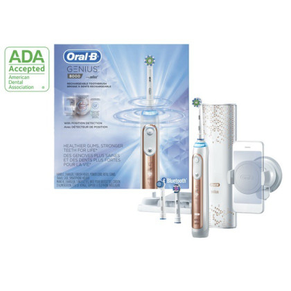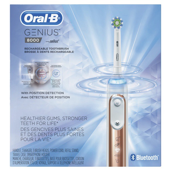 About This Item We aim to show you accurate product information. Manufacturers, suppliers and others provide what you see here, and we have not verified it. See our disclaimer Use the Oral-B App to seamlessly pair your Genius 8000 with a smartphone and you're on your way to brushing like your dentist recommends. The Oral-B Genius 8000 comes with Position Detection technology which uses Bluetooth technology, your smartphone, and facial recognition technology to provide you with real-time feedback about your brushing habits. The 360 SmartRing with LED lights allows you to personalize your brushing experience with your choice of 12 colors. The SmartRing works with the integrated timer and pressure sensor to provide you with visual feedback on brushing time and brushing pressure. Together, they help you ensure you brush for the recommended 2-minutes while making sure you brush with appropriate pressure to protect your gums from over-brushing. The premium Smart Travel Case lets you charge your brush and smartphone (via USB) at the same time while using only one wall plug. The Genius features 6 brushing modes so you can further customize your brushing experience based on your specific oral care goals. This highly advanced brush features a dentist-inspired round head that surrounds and cups each tooth with dynamic oscillating, rotating and pulsating movements to remove up to 500% more plaque than a regular manual toothbrush. Trust in the precision engineering of Braun and the dental expertise of Oral-B, the #1 brand used and recommended by dentists worldwide. 100% Satisfaction Guaranteed. Manufacturer Contact Information Customer support : (800) 566-7252 or (800) 566-ORALB Oral-B Genius 8000 Electronic Toothbrush, Black Edition, Powered by Braun: Position Detection to help you know where you've brushed, so you never miss a zone Multicolor SmartRing on electric toothbrush provides coaching on brushing time Pressure sensor technology slows brush speed to protect gums Rechargeable with 6 cleaning modes allow you to brush based on your needs Smart Travel toothbrush case for dual cell phone and brush handle charging Compatible with Oral-B brush heads for every oral care need: CrossAction, FlossAction, Precision Clean, 3D White, Sensitive Gum Care, Deep Sweep, Dual Clean Oral-B is the #1 dentist-recommended toothbrush brand worldwide