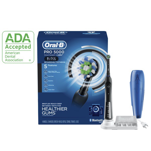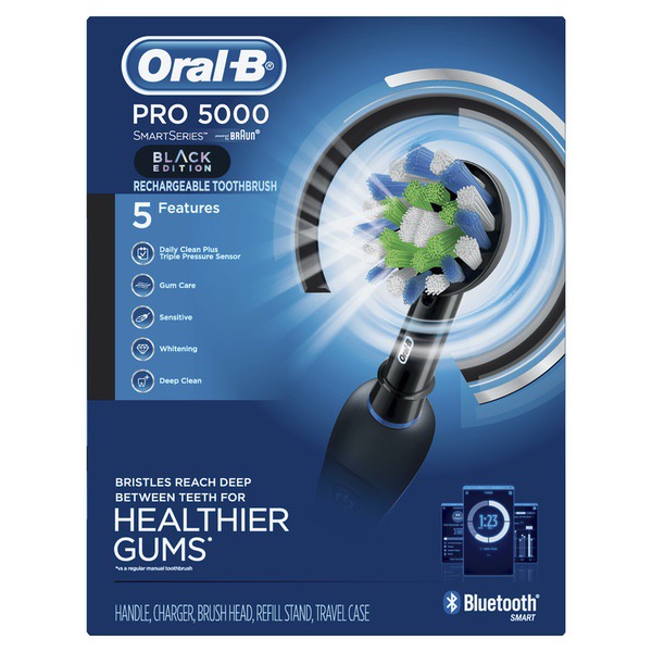 About This Item We aim to show you accurate product information. Manufacturers, suppliers and others provide what you see here, and we have not verified it. See our disclaimer The Oral-B Pro 5000 SmartSeries Power Rechargeable Electric Toothbrush with Bluetooth Connectivity features a CrossAction brush head with bristles that reach deep between teeth for healthier gums.* Bluetooth communication allows the brush to connect with your smartphone to give you real-time feedback on your brushing habits and create a dental care journey based on your oral health goals. The Visible Pressure Sensor on the brush lights up to tell you when you apply too much pressure to your teeth and gums to help prevent harmful over-brushing. The toothbrush features 5 cleaning modes and a timer to help you brush for a dentist recommended 2 minutes. Oral-B Pro 5000 is compatible with a variety of replacement toothbrush heads and includes a convenient travel toothbrush holder. *vs a regular manual toothbrush Trust in the precision engineering of Braun and the dental expertise of Oral-B, the #1 brand used and recommended by dentists worldwide. 100% Satisfaction Guaranteed. Manufacturer Contact Information Customer support : (800) 566-7252 or (800) 566-ORALB Oral-B Pro 5000 SmartSeries Electric Toothbrush with Bluetooth Connectivity, Black Edition, Powered by Braun: Includes Handle, Charger, Brush Head, Refill Stand & Travel Case Bluetooth communication provides real-time feedback on brushing habits Round brush head for a tooth-by-tooth clean Visible Pressure Sensor lights up to alert you when you are brushing too hard Electric Toothbrush featuring 5 cleaning modes allow you to brush based on your needs Compatible with Oral-B brush heads for every oral care need: CrossAction, FlossAction, Precision Clean, 3D White, Sensitive Gum Care, Deep Sweep, Dual Clean Oral-B is the #1 dentist-recommended toothbrush brand worldwide