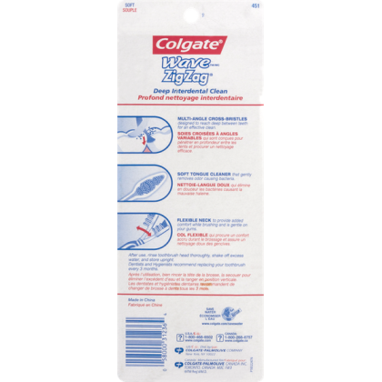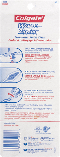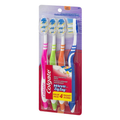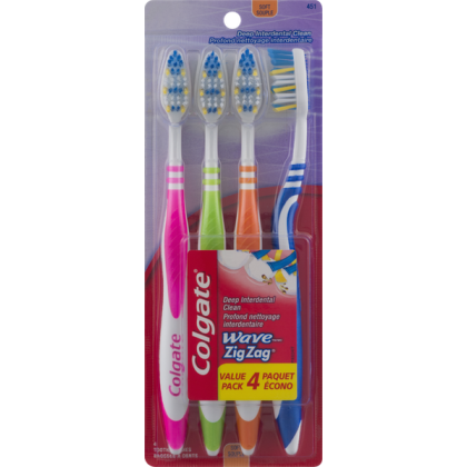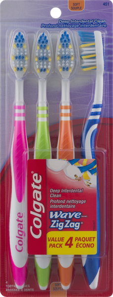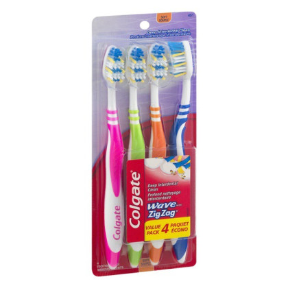 About This Item We aim to show you accurate product information. Manufacturers, suppliers and others provide what you see here, and we have not verified it. See our disclaimer Colgate ZigZag Deep Clean manual toothbrush is designed with V SHAPED CROSS BRISTLES to reach deep between teeth for an effective clean. It also has a soft tongue cleaner that gently removes odor causing bacteria. Remember to change your toothbrush every 3 months. Colgate Wave Zig Zag Soft Toothbrush, 4-Pack: Colgate Wave Zig Zag toothbrushes soft, 4-count Deep interdental clean Value pack Multi-angle cross-bristles designed to reach deep between teeth for an effective clean Colgate wave toothbrush, 4-pack, has a soft tongue cleaner that gently removes odor causing bacteria Flexible neck to provide added comfort while brushing and is gentle on your gums Save water, www.colgate.com/savewater U.S.A. 1-800-468-6502 www.colgate.com
