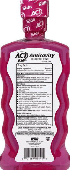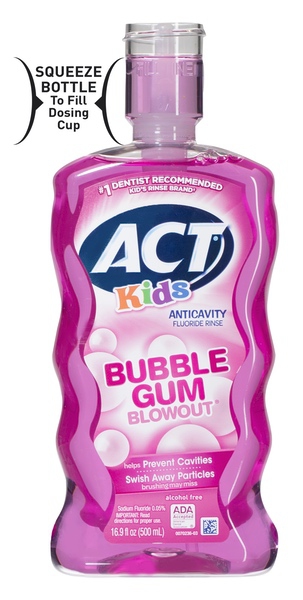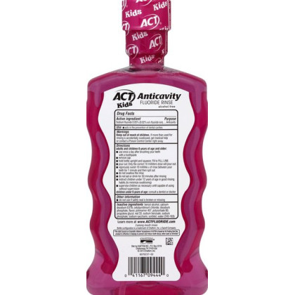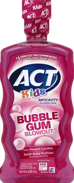 About This Item We aim to show you accurate product information. Manufacturers, suppliers and others provide what you see here, and we have not verified it. See our disclaimer ACT® Anticavity Fluoride Rinse is available in great tasting flavors developed just for kids! Kids love the way it tastes, and you’ll love knowing that they’re using the #1 Dentist Recommended cavity-fighting tool. ACT® Anticavity Kids Rinses are proven effective in reducing children’s cavities up to 40% more than brushing with a fluoride toothpaste alone, while strengthening their developing teeth up to 3X harder.(1) Every ACT® Anticavity Kids formula provides maximum fluoride in a convenient 1-time-a-day formula! Just 60 seconds a day and they’re done! Our easy to use dosage meter puts kids in control of the experience – it’s fun to use but also helps minimize the mess and gives an exact 10ml dosage every time. 1) Data on file at Chattem, Inc. And Heifetz SB, Meyers RJ, and Kingman A. A Comparison of the Anticavities Effectiveness of Daily and Weekly Rinsing with Sodium Fluoride Solutions: Final Results After 3 Years. Journal of Dental Research, 60 (Special Issue A) Abstract 645 (March 1981). ACT® Kids Anticavity Bubblegum Blowout® Mouthwash, 16.9oz: Swish away particles brushing may have left behind Helps Prevent Cavities Strengthens Teeth Easy-to-use dosage meter Alcohol Free ADA Seal of Acceptance
