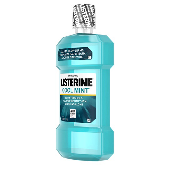 About This Item We aim to show you accurate product information. Manufacturers, suppliers and others provide what you see here, and we have not verified it. See our disclaimer Protect your mouth from germs and get fresh breath with Listerine Cool Mint Antiseptic Mouthwash. It kills 99.9% of germs that cause bad breath, plaque and gingivitis, for a fresher and cleaner mouth than brushing alone. Accepted by the American Dental Association, this germ-killing mouthwash is clinically shown to reduce plaque 52 percent more and reduce gingivitis 21 percent more than brushing and flossing alone. Adding a 30-second rinse to your morning and evening routines is all it takes to get 24-hour germ protection and achieve maximum results. Listerine Cool Mint Antiseptic Mouthwash leaves your mouth feeling intensely clean. 1.5-l of antiseptic mouthwash from the #1 dentist recommended brand of over the counter mouthwashes Oral care formula is clinically proven to kill germs that cause bad breath, plaque and gingivitis Mouthwash accepted by the American Dental Association to be safe and effective for oral care use Infused with intense Cool Mint flavor, use this mouthwash for a deeper clean and fresher breath Antiseptic mouthwash with refreshing mint flavor offers 24-hour protection against germs* Clinically shown to reduce more plaque and gingivitis than brushing and flossing alone Get the germ-killing benefits by rinsing full strength for 30 seconds both morning and night With approximately five weeks of supply, this 1.5-L bottle provides continuous and effective oral care *With twice daily use