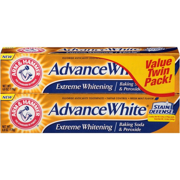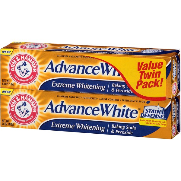 About This Item We aim to show you accurate product information. Manufacturers, suppliers and others provide what you see here, and we have not verified it. See our disclaimer Arm & Hammer Advance White Extreme Whitening Baking Soda and Peroxide Toothpaste, 6 Ounce, Twin Pack Tartar Control Fluoride Anticavity Stain Defense™ Value Twin Pack!