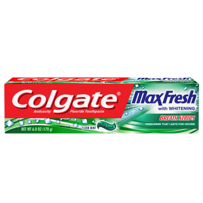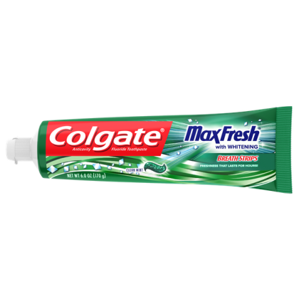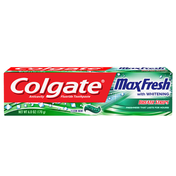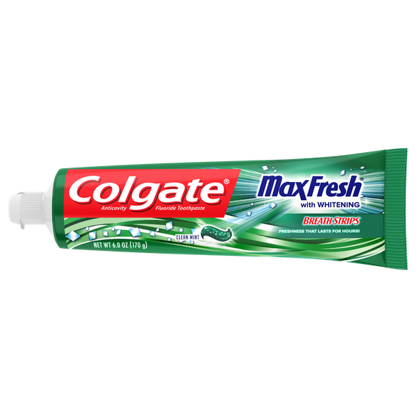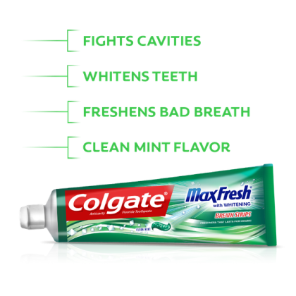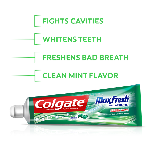 About This Item We aim to show you accurate product information. Manufacturers, suppliers and others provide what you see here, and we have not verified it. See our disclaimer You can breathe confidently with Colgate Max Fresh Toothpaste with Breath Strips and a great Clean Mint flavor. Our unique toothpaste formula is packed with hundreds of mini breath strips and unleashes a powerful rush of freshness for long-lasting fresh breath. Colgate Max Fresh Toothpaste with Breath Strips invigorates your brushing experience and leaves your breath feeling fresh for hours. Plus, it fights cavities and whitens teeth leaving you with a healthy smile. Colgate® Clean Mint Max Fresh® Whitening Breath Strips Toothpaste.Freshness That Lasts for HoursPacked with Hundreds of Mini Breath StripsFluoride Toothpaste to Fight Cavities Whitens Teeth by Removing Surface StainsSugar Free, Gluten Free