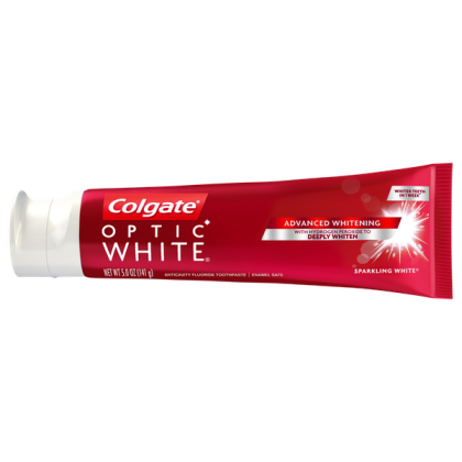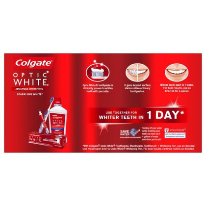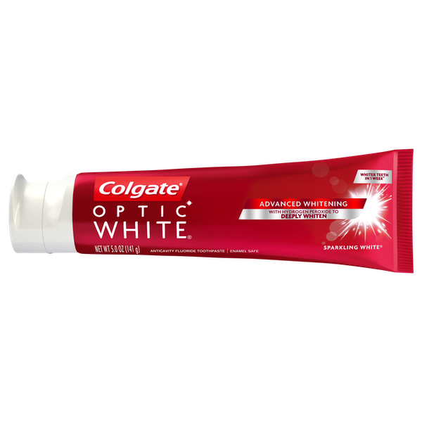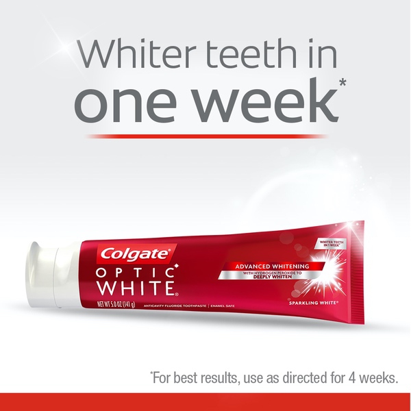 About This Item We aim to show you accurate product information. Manufacturers, suppliers and others provide what you see here, and we have not verified it. See our disclaimer Colgate Optic White Sparkling Mint whitening toothpaste goes beyond surface-stain removal to deeply whiten teeth for a brighter smile. With regular use, this anticavity fluoride toothpaste removes stains beyond the surface to deeply whiten teeth with hydrogen peroxide, unlike ordinary toothpaste and it has a cool fresh mint flavor to help freshen your breath. Colgate Optic White whitening toothpaste, icy mint, is enamel safe and whitens teeth in 1 week. With regular use, this whitening toothpaste removes intrinsic teeth stains ordinary toothpastes don't. Whitens teeth more than 3 shades (brushing twice daily for 4 weeks), Results start in just one week! Has a special formula made with enamel-safe whitening toothpaste ingredients.