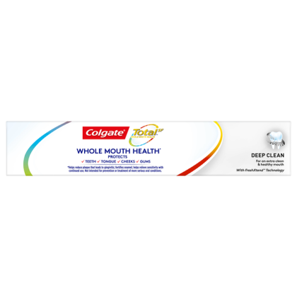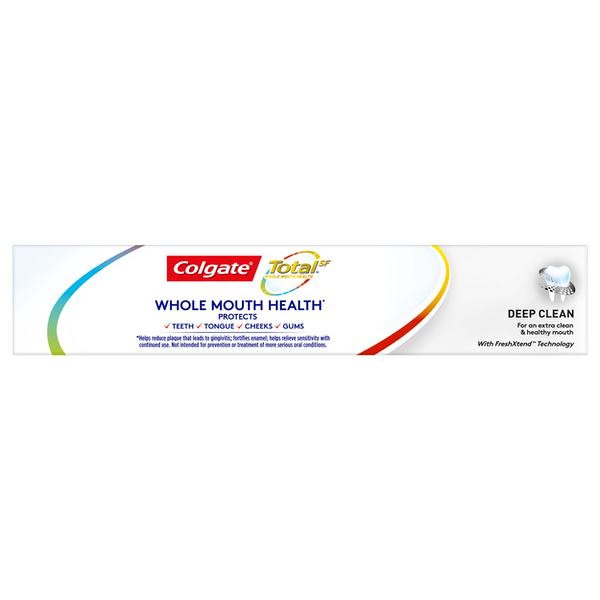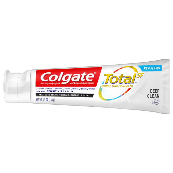 About This Item We aim to show you accurate product information. Manufacturers, suppliers and others provide what you see here, and we have not verified it. See our disclaimer Colgate Total Deep Clean Toothpaste has a breakthrough formula that fights bacteria on teeth, tongue, cheeks and gums for Whole Mouth Health. Colgate Total with stannous fluoride also offers more benefits than ever including sensitivity relief, improved enamel strength* and odor neutralization* (*based on in vitro studies) Breakthrough Formula Toothpaste with Hydrated Silica for an Excellent Clean Fights Bacteria on Teeth, Tongue, Cheeks and Gums for Whole Mouth Health Helps Prevent Plaque, Tartar, Cavities & Gingivitis Now with Relief for Sensitive Teeth Paste Toothpaste Formula