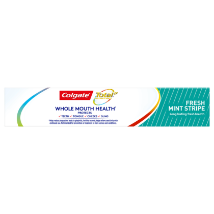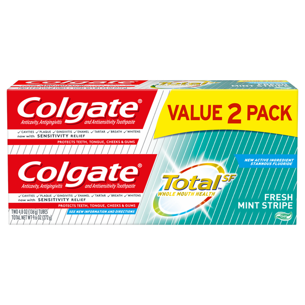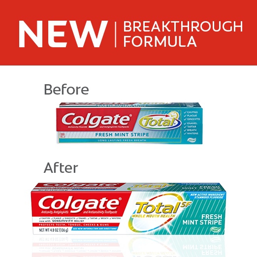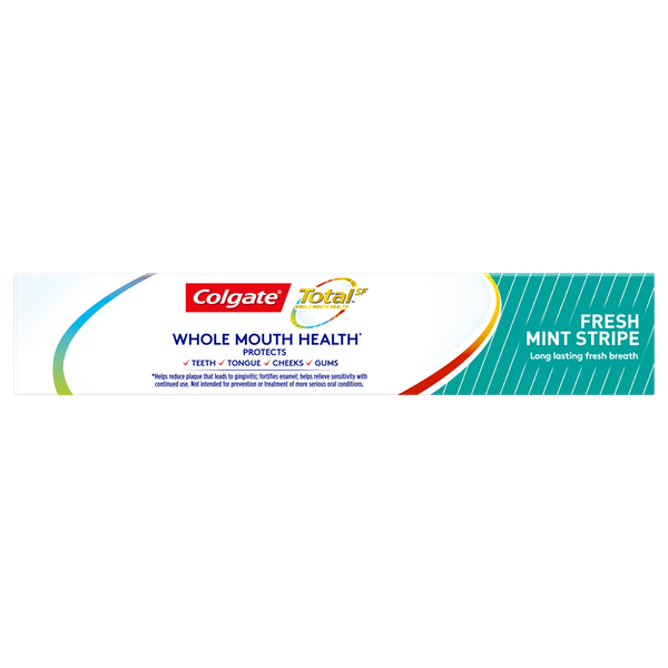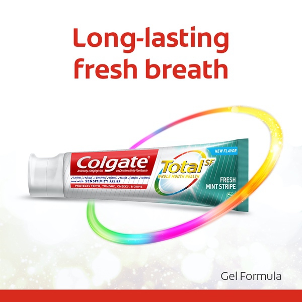 About This Item We aim to show you accurate product information. Manufacturers, suppliers and others provide what you see here, and we have not verified it. See our disclaimer Colgate Total Fresh Mint Toothpaste has a breakthrough formula that fights bacteria on teeth, tongue, cheeks and gums for Whole Mouth Health. Colgate Total with stannous fluoride also offers more benefits than ever including sensitivity relief, improved enamel strength* and odor neutralization* (*based on in vitro studies) Breakthrough Formula Mint Toothpaste for Long Lasting Fresh Breath Fights Bacteria on Teeth, Tongue, Cheeks and Gums for Whole Mouth Health Fights Germs for an Extra Healthy Smile Helps Prevent Plaque, Tartar, Cavities & Gingivitis Now with Relief for Sensitive Teeth Gel Toothpaste Formula