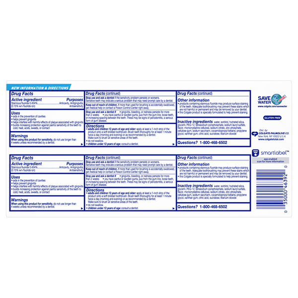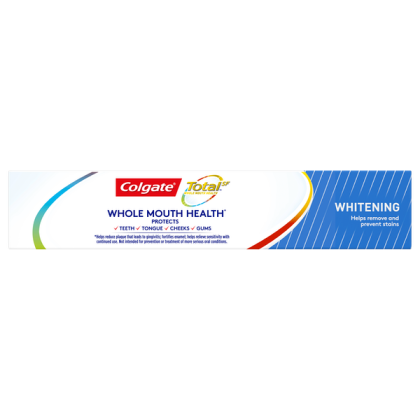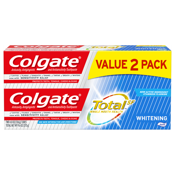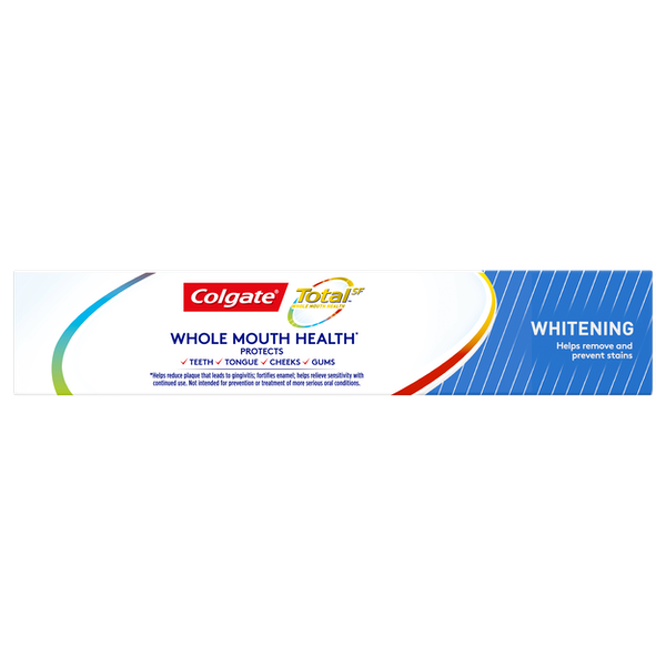 About This Item We aim to show you accurate product information. Manufacturers, suppliers and others provide what you see here, and we have not verified it. See our disclaimer Colgate Total Whitening Toothpaste has a breakthrough formula that fights bacteria on teeth, tongue, cheeks and gums for Whole Mouth Health. Colgate Total with stannous fluoride also offers more benefits than ever including sensitivity relief, improved enamel strength* and odor neutralization* (*based on in vitro studies) Breakthrough Formula Whitening Toothpaste that Removes and Prevents New Stains Fights Bacteria on Teeth, Tongue, Cheeks and Gums for Whole Mouth Health Mint Toothpaste for Long Lasting Fresh Breath Helps Prevent Plaque, Tartar, Cavities & Gingivitis Now with Relief for Sensitive Teeth Paste Toothpaste Formula