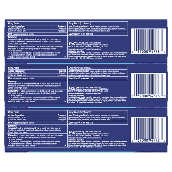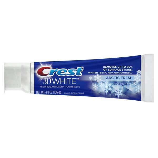 About This Item We aim to show you accurate product information. Manufacturers, suppliers and others provide what you see here, and we have not verified it. See our disclaimer Brighten your smile with Crest 3D White Arctic Fresh Whitening Toothpaste. It whitens your teeth by removing up to 80% of surface stains and protects against future stains. 3D White fluoride toothpaste also strengthens your tooth enamel and helps protect against cavities. Crest 3D White Arctic Fresh Whitening Toothpaste, Icy Cool Mint, 4.8 oz (Pack of 2): Whitens teeth by removing up to 80% of surface stains Protects teeth against future stains Strengthens teeth and safe on tooth enamel Fluoride toothpaste protects against cavities Icy Cool Mint Flavor