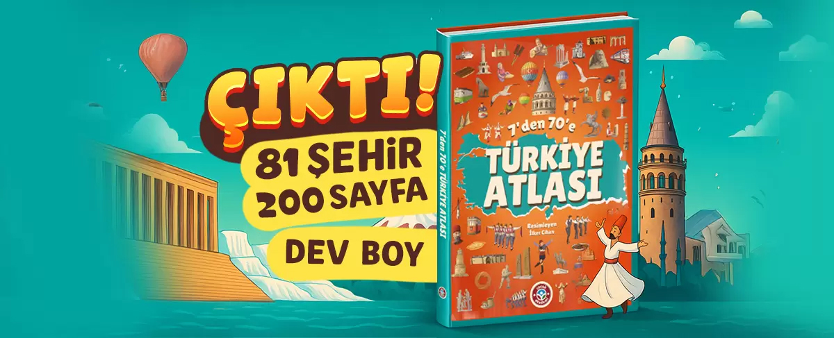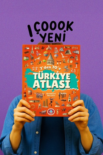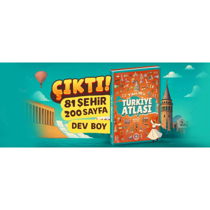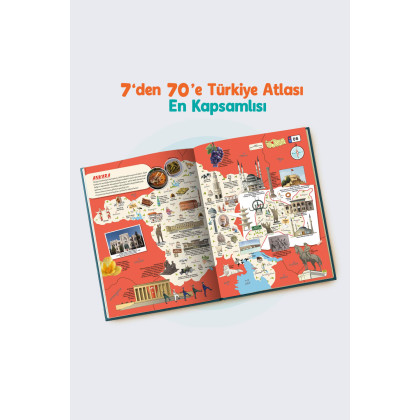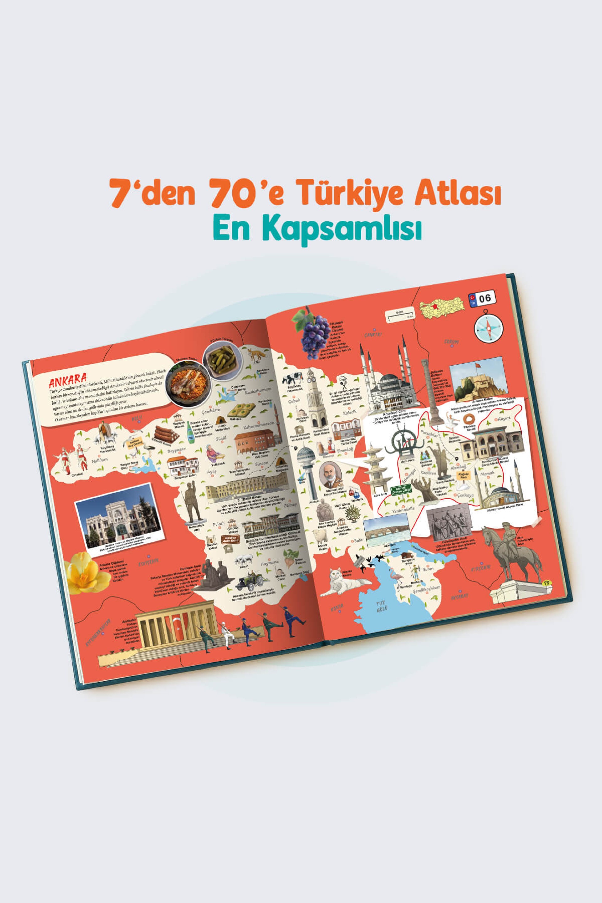 7'den 70'e Türkı̇ye Atlası ile Türkiye’nin 81 şehrinin, bölgelerinin ve Kuzey Kıbrıs Türkiye Cumhuriyeti’nin tarihini-kültürünü çocuğunuza sunabilirsiniz. Tamamı özgün çizimlerden oluşan bu dev boy atlas toplam 200 sayfadan oluşuyor. Çocukların, gençlerin hatta sizin de dikkatinizi çekecek çizimler ile tüm şehirlerin doğal güzelliklerini, tarihi mekanlarını, meşhur yiyeceklerini, sanat ve spor aktivitelerini keşfedebilirsiniz. Atlasta Marmara, İç Anadolu bölgesi gibi kapsamlı bölge haritasının ardından o bölgedeki şehirler sıralanmıştır. Kız Kulesi, Bandırma Vapuru, İshak Paşa Sarayı, Aspendos Tiyatrosu gibi tüm şehirlerin tarihi mekanları gerçekçi hali ile resmedilmiştir. Kebap, pide, mantı, baklava gibi yöresel yiyeceklerin çizimleri haritalara yerleştirilmiştir. Dağ, akarsu, orman gibi şehirlerin coğrafi özelliklerine; nüfus, tarım, hayvancılık, zanaatkarlık gibi beşeri özelliklerine de detaylı şekilde yer verilmiştir. Halk oyunları, yöresel kıyafetler gibi aktiviteler ile şehirler bir görsel şölene dönüşmüştür. Türkiye hakkındaki en detaylı turistik atlas olan 7'den 70'e Türkı̇ye Atlası ile geleceğimiz çocukların ülkesini, kültürünü merakla tanıması amaçlanmıştır.
